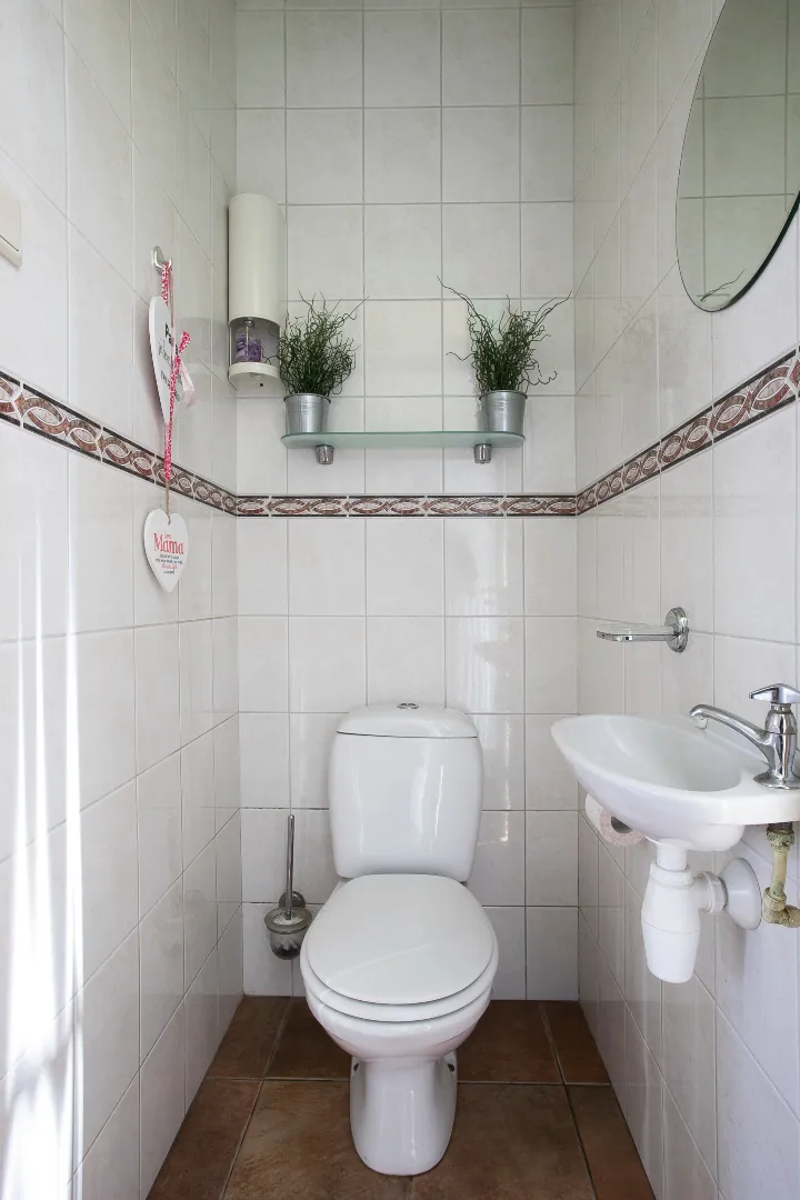 U betreedt de woning via de hal/entree met tegelvloer, meterkast (moderne kast met 4 groepen en aardlekschakelaar), volledig betegeld toilet met fonteintje en ontluchting, trapopgang naar de eerste verdieping en doorgang naar de keuken.