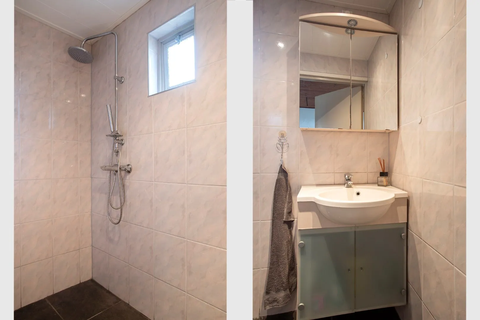Vanaf de zijkant heb je toegang tot de woning en kom je uit in een grote bijkeuken. Deze geeft toegang tot een toilet, en een doucheruimte met wastafel. Een vlizotrap geeft toegang tot een grote bovenverdieping met voldoende stahoogte. Hier hangt de boiler uit 2022. Als een soort tussenverbinding tussen de woning en de garage is nog een serre gebouwd.