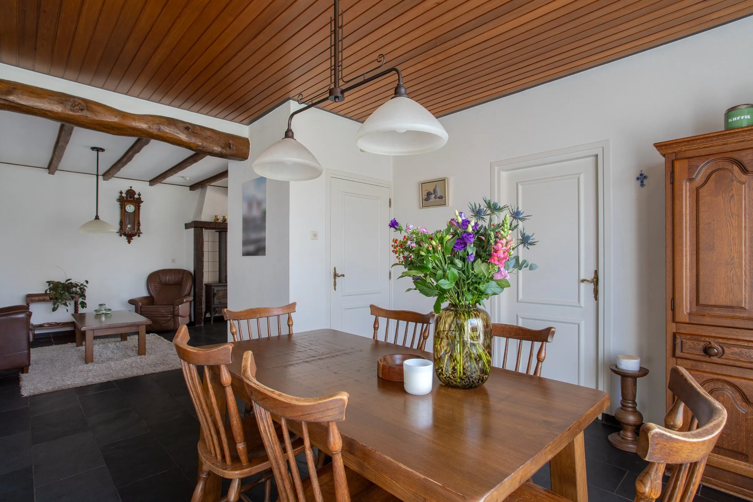 Via de voordeur kom je in de hal van de woning met de meterkast (5 gr.), de trapopgang en de doorgang naar de woonkamer. De vloer is hier en de rest van de begane grond voorzien van een fraaie antraciet tegelvloer. Als we doorlopen komen we in een royale woonkamer met ook hier en in de keuken eenzelfde tegelvloer met vloerverwarming. De raampartijen zorgen voor veel lichtinval. In de woonkamer neemt de schouw met houtkachel een centrale plaats in. De authentieke balken met daartussen stucwerk passen mooi in deze woonkamer.