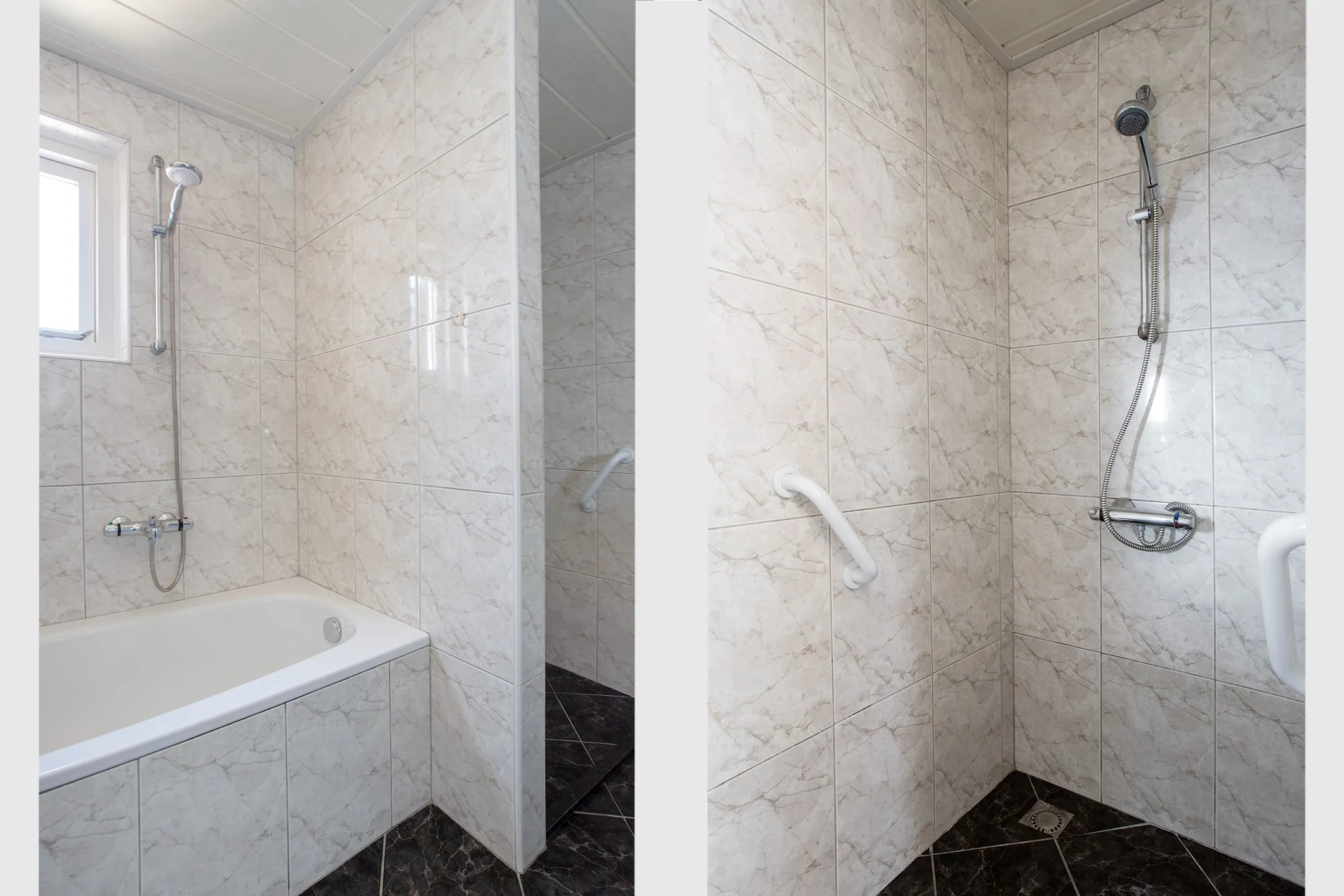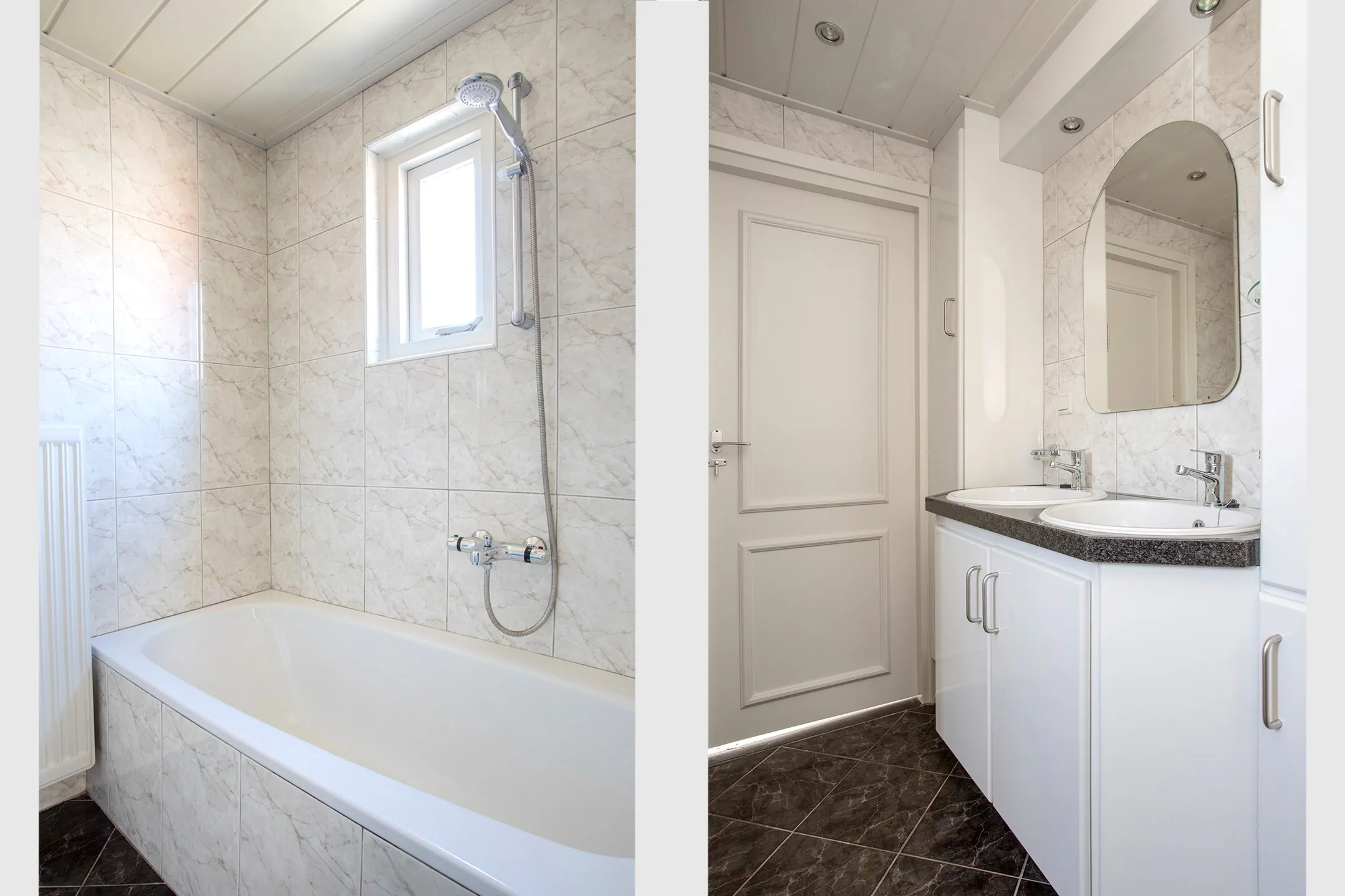 Achter de woning is een royale bijkeuken als ingang vanuit de tuin. Dis is de buffer tussen de woning en de mantelzorgwoning. Vanuit de bijkeuken heb je toegang tot het toilet en de badkamer, welke voorzien is van een bad, inloopdouche en dubbele wastafel in badmeubel. Hier is ook de aansluiting voor de wasmachine. In een inbouwkast hangt de vrijwel nieuwe (2024) cv-ketel van het merk NEFIT en de pomp van de vloerverwarming.