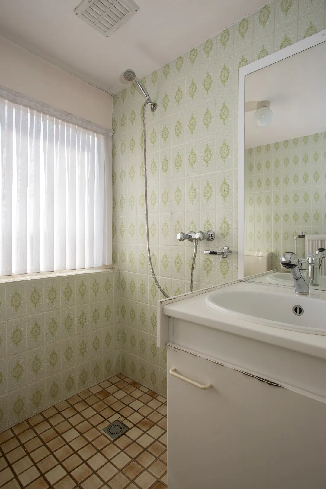 De badkamer hier is eenvoudig met een douche, wastafel en toilet.