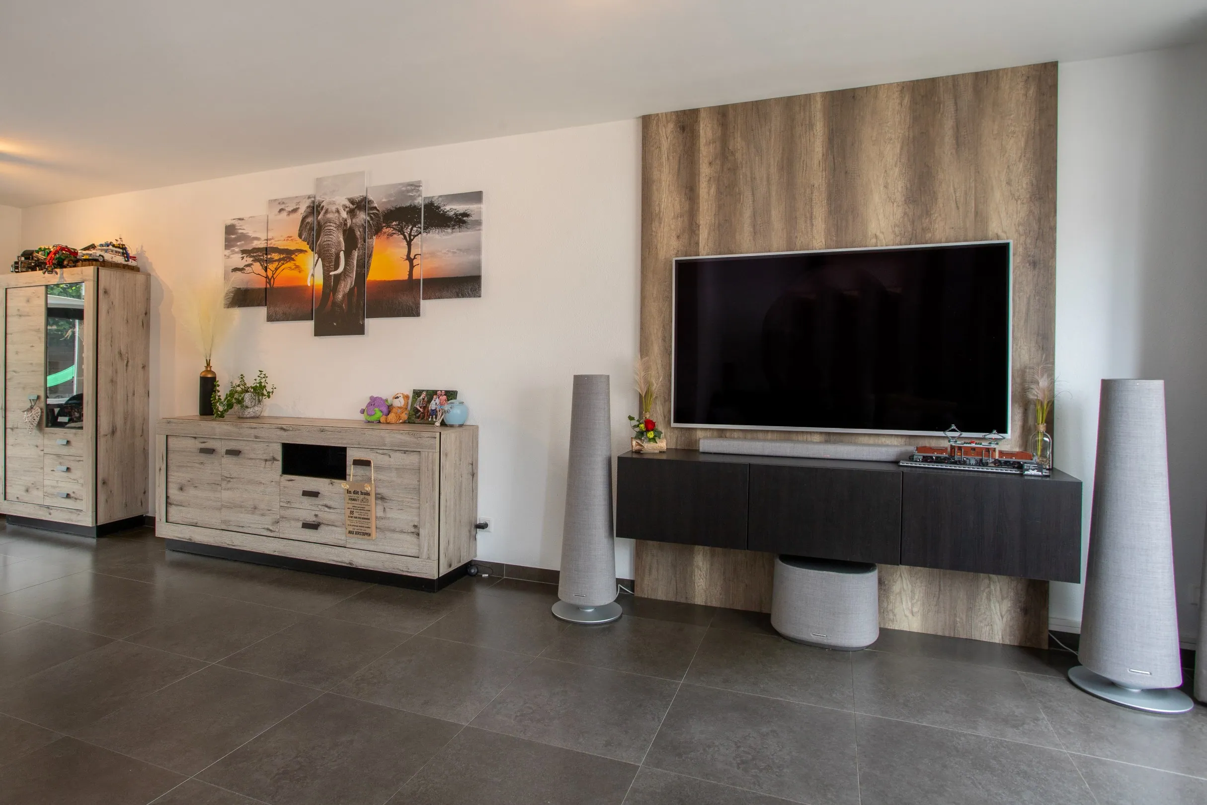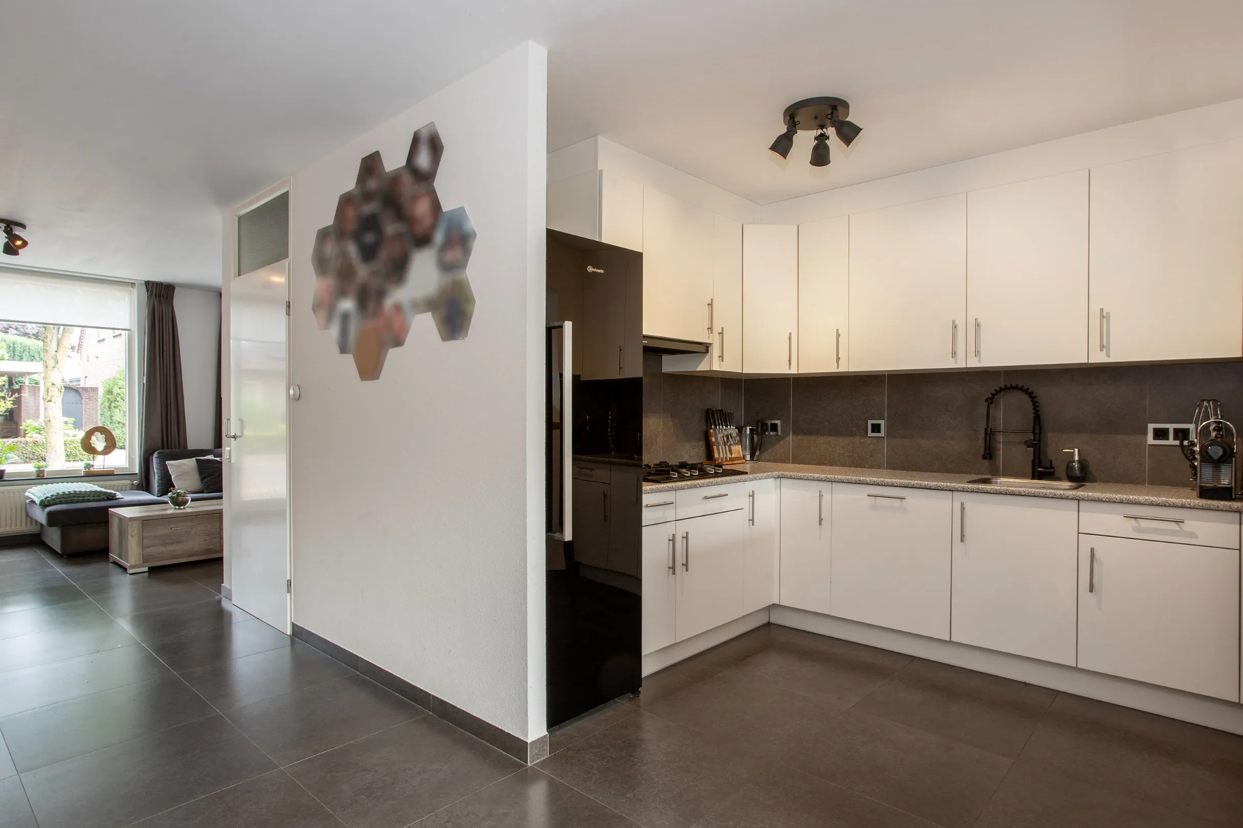 Via de nette hal (met een modern toilet en moderne in 2019 vernieuwd 3 fase meterkast) kom je in de ruime L-vormige woonkamer met open keuken. De grote ramen zorgen voor veel licht, en dankzij de royale uitbouw voelt het extra ruim aan. De vloer is strak betegeld en voorzien van vloerverwarming – lekker comfortabel!