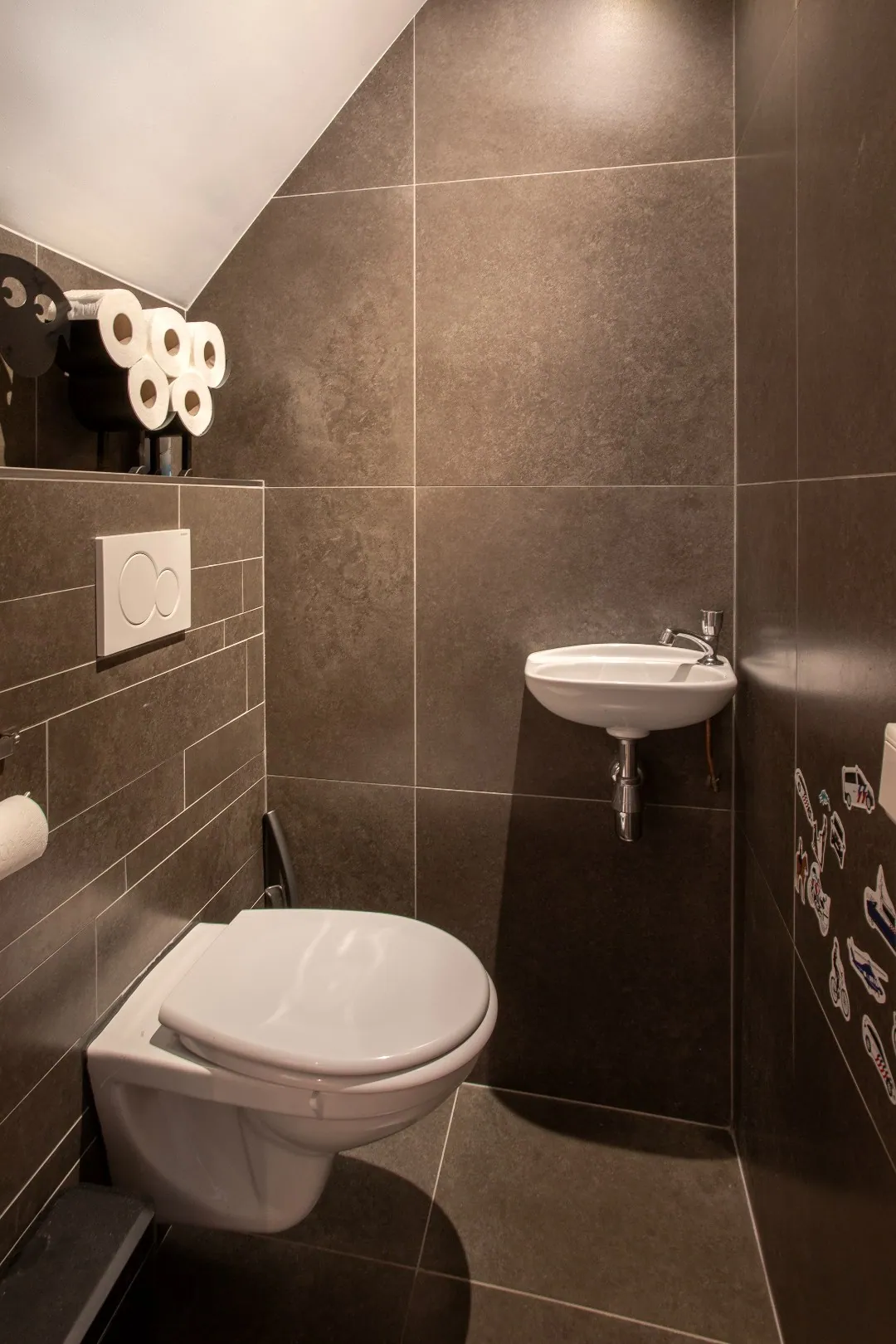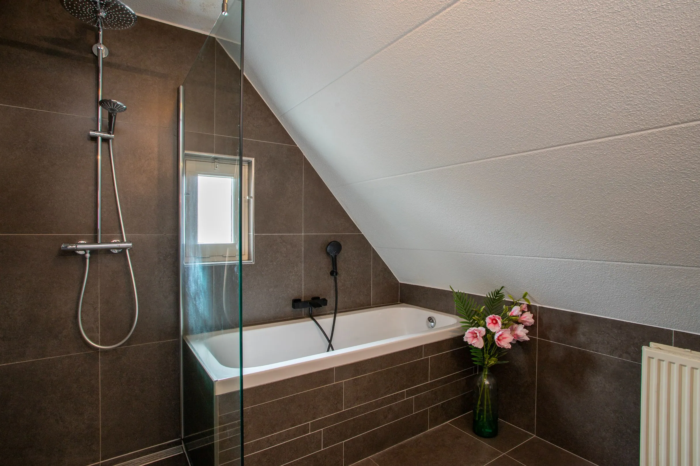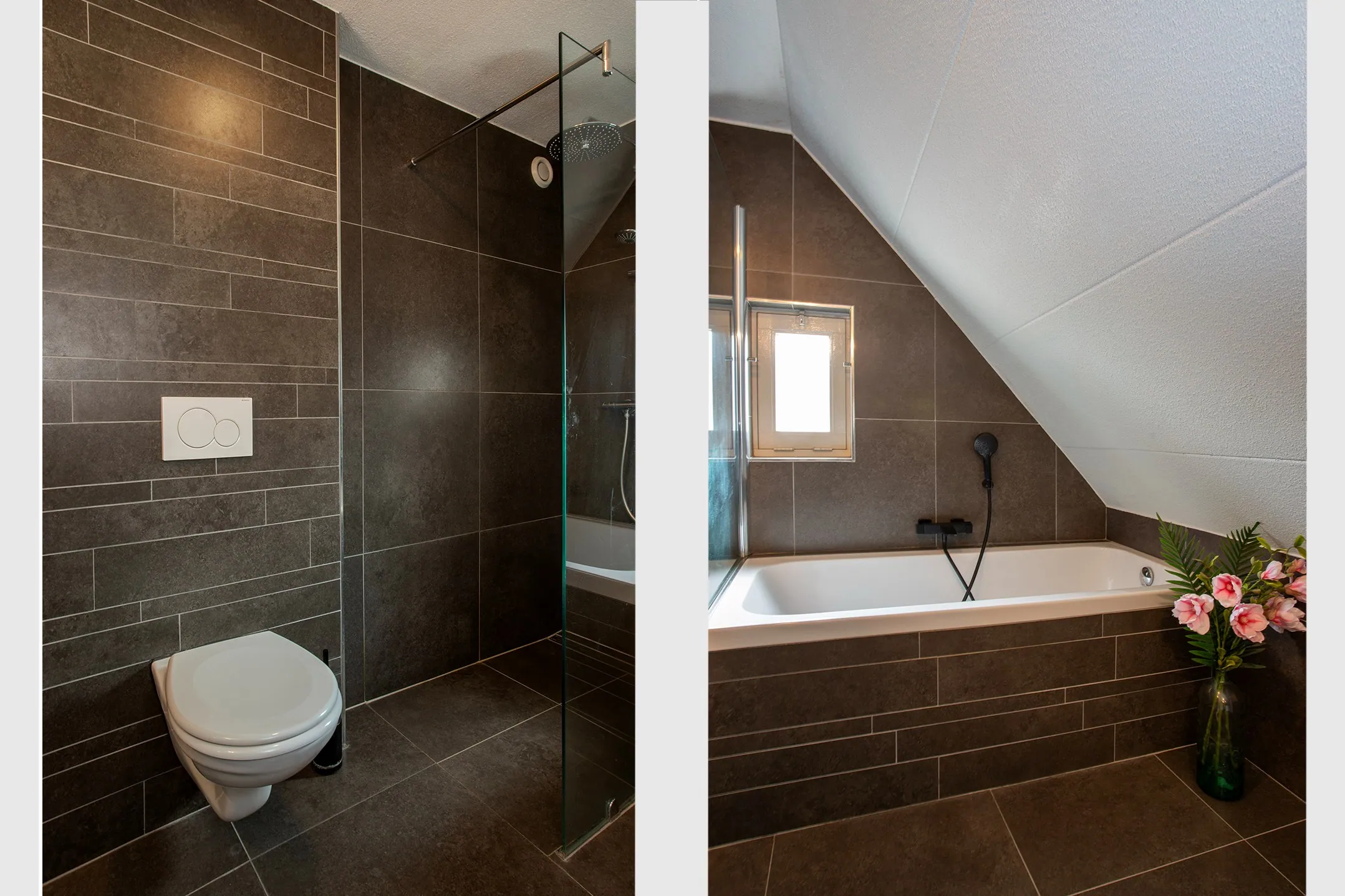 Hier vind je drie slaapkamers, allemaal keurig afgewerkt met gestucte wanden en plafonds. De afmetingen verschillen, maar ze zijn allemaal ruim genoeg van omvang. De moderne volledig betegelde badkamer is van alle gemakken voorzien: een ligbad, inloopdouche met glazen wand, hangtoilet en een wastafelmeubel met dubbele wasbak.