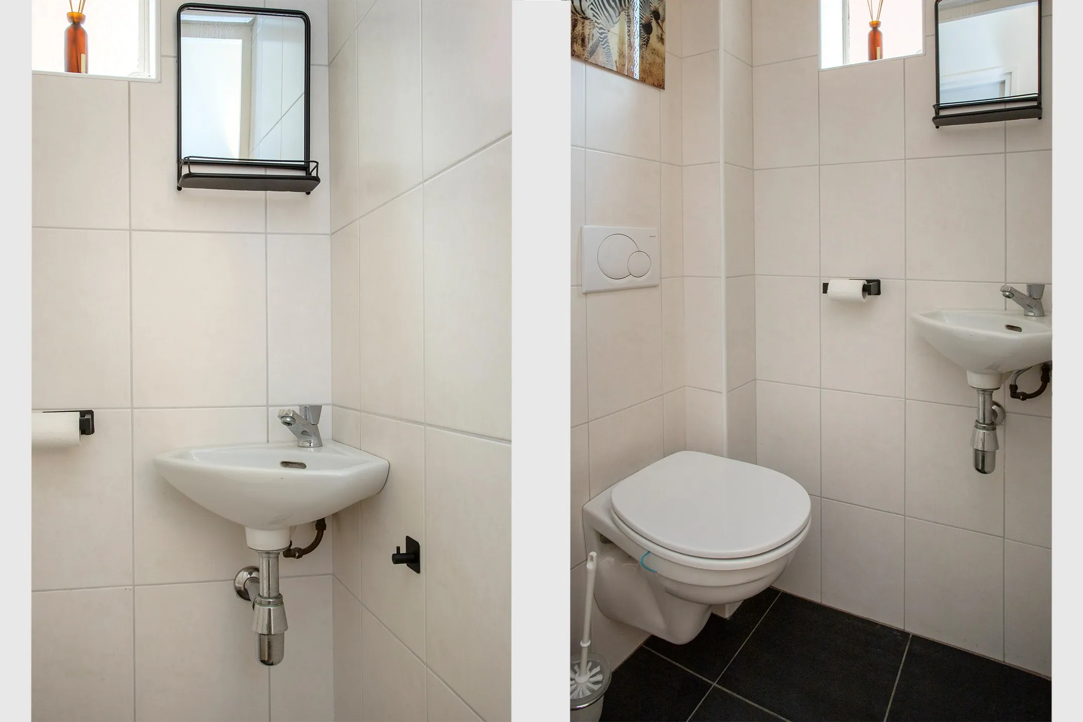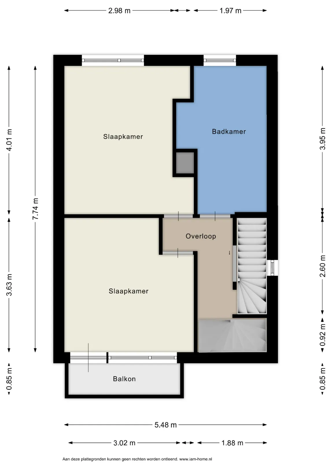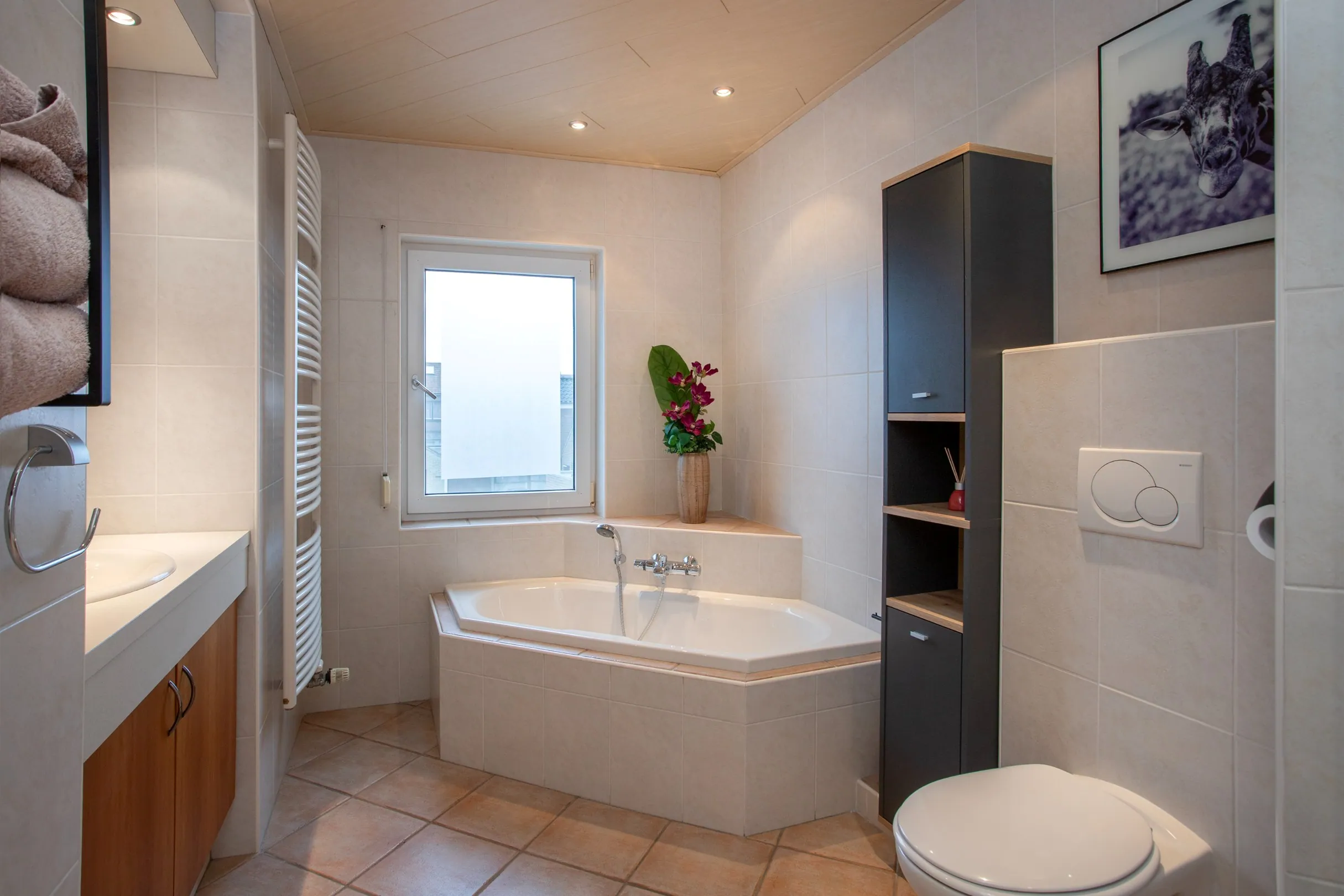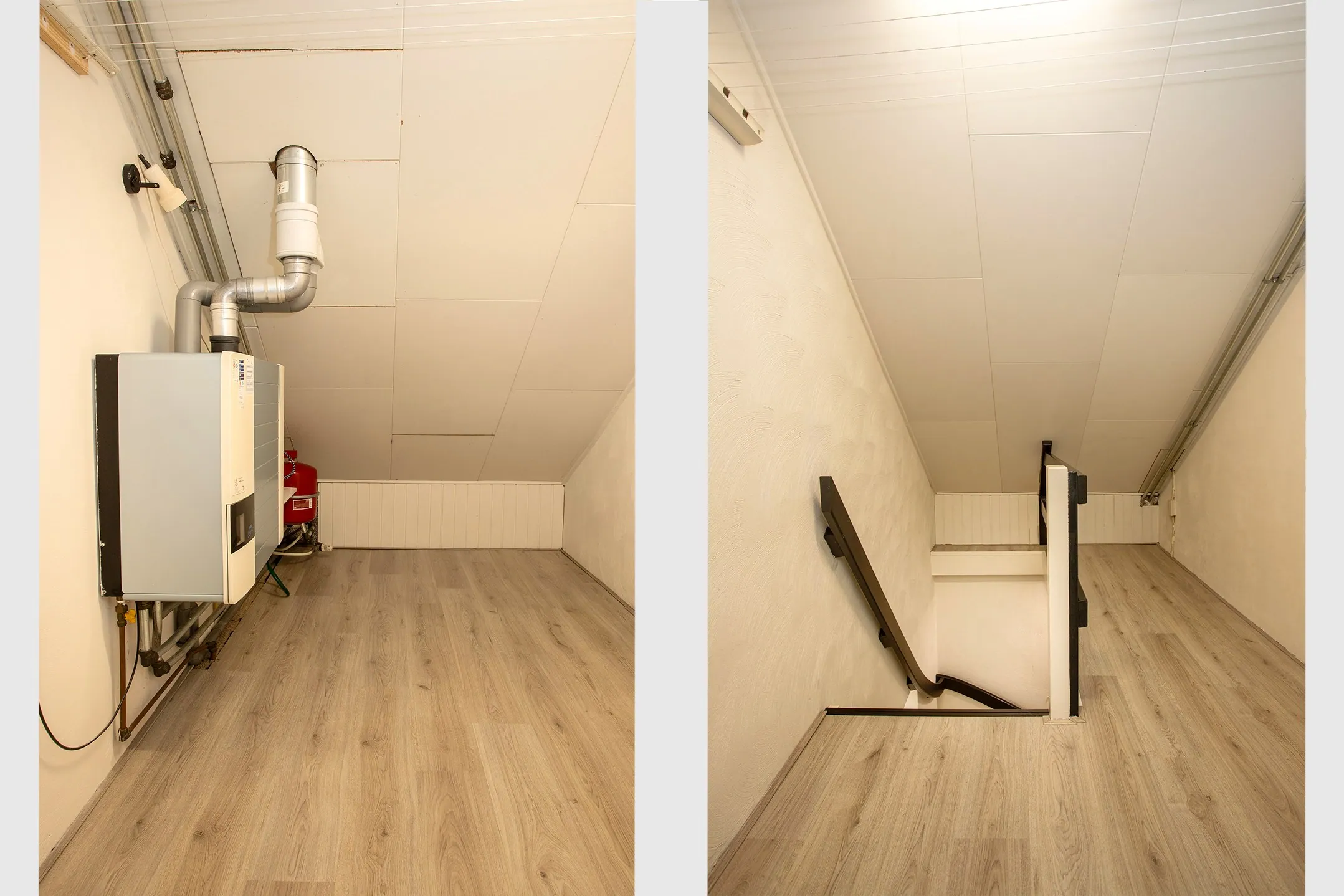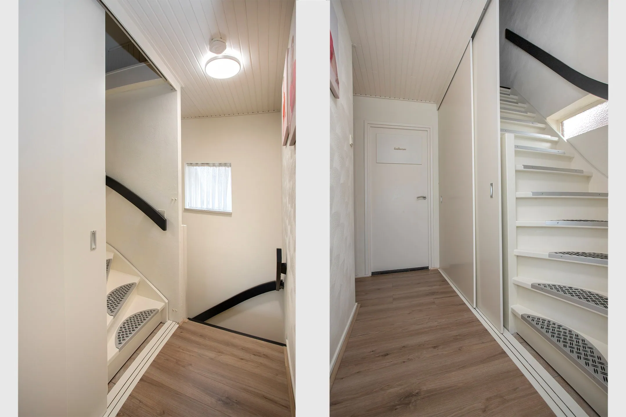 De overloop geeft toegang tot twee slaapkamers, de badkamer en de vaste trap naar de tweede verdieping. Onder de trap zijn de aansluitingen voor wasmachine en droger netjes weggewerkt.
