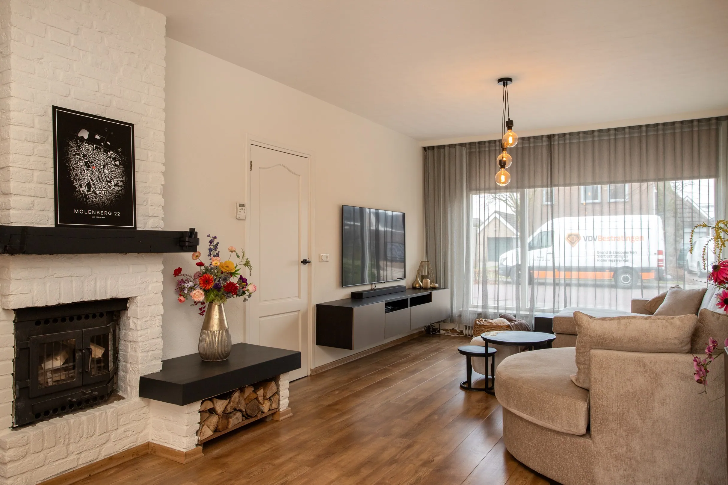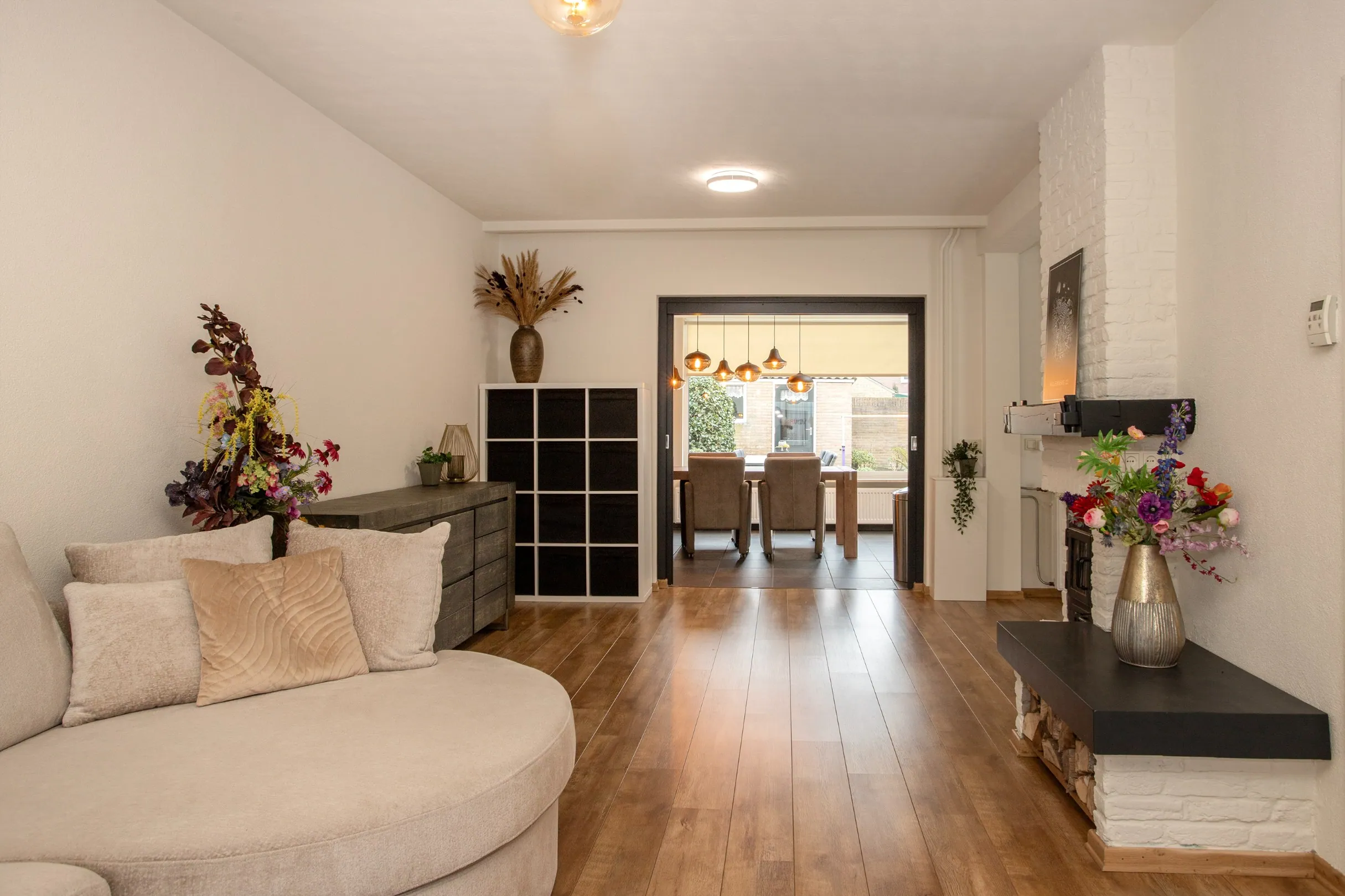Via de ruime hal/entree met tegelvloer betreedt u de woning. Hier bevinden zich de trapopgang, meterkast, trapkast, een hangend toilet met fonteintje en een praktische garderobenis. Vanuit de hal heeft u toegang tot de woonkamer. De woonkamer is ruim en licht dankzij de grote raampartijen aan de voorzijde. De ruimte is afgewerkt met stucwerkwanden en plafonds en een laminaatvloer. De houtkachel vormt een sfeervol middelpunt in de kamer en creëert daarnaast een gezellige extra hoek, ideaal als speelhoek, studieplek of thuiswerkplek.