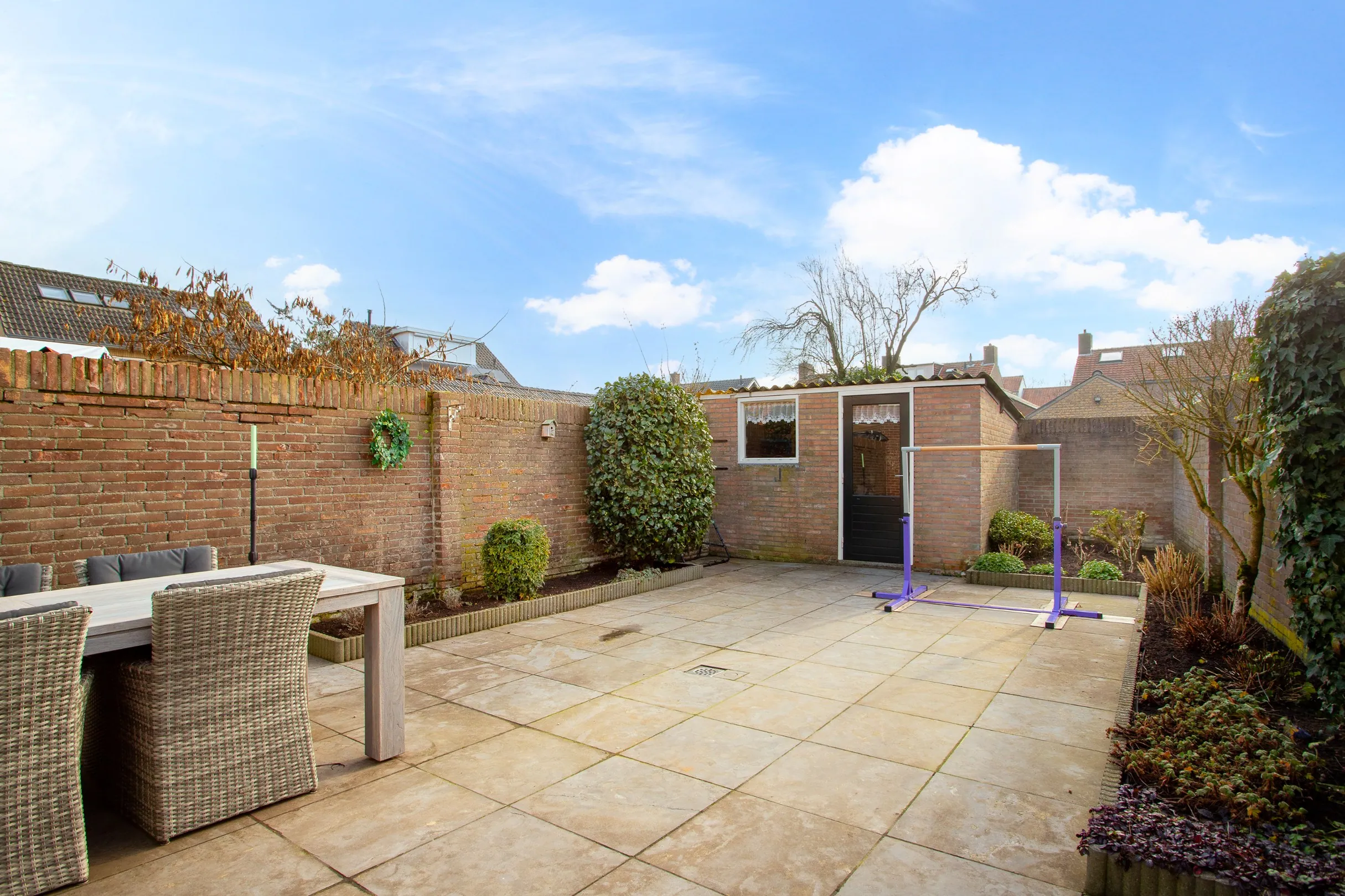 De woning beschikt over een zonnige achtertuin op het zuiden en een voortuin met parkeergelegenheid. De achtertuin is verzorgd aangelegd met fraaie bestrating en diverse vaste planten, beschikt over een vrije achterom en een fietsenberging met elektra.