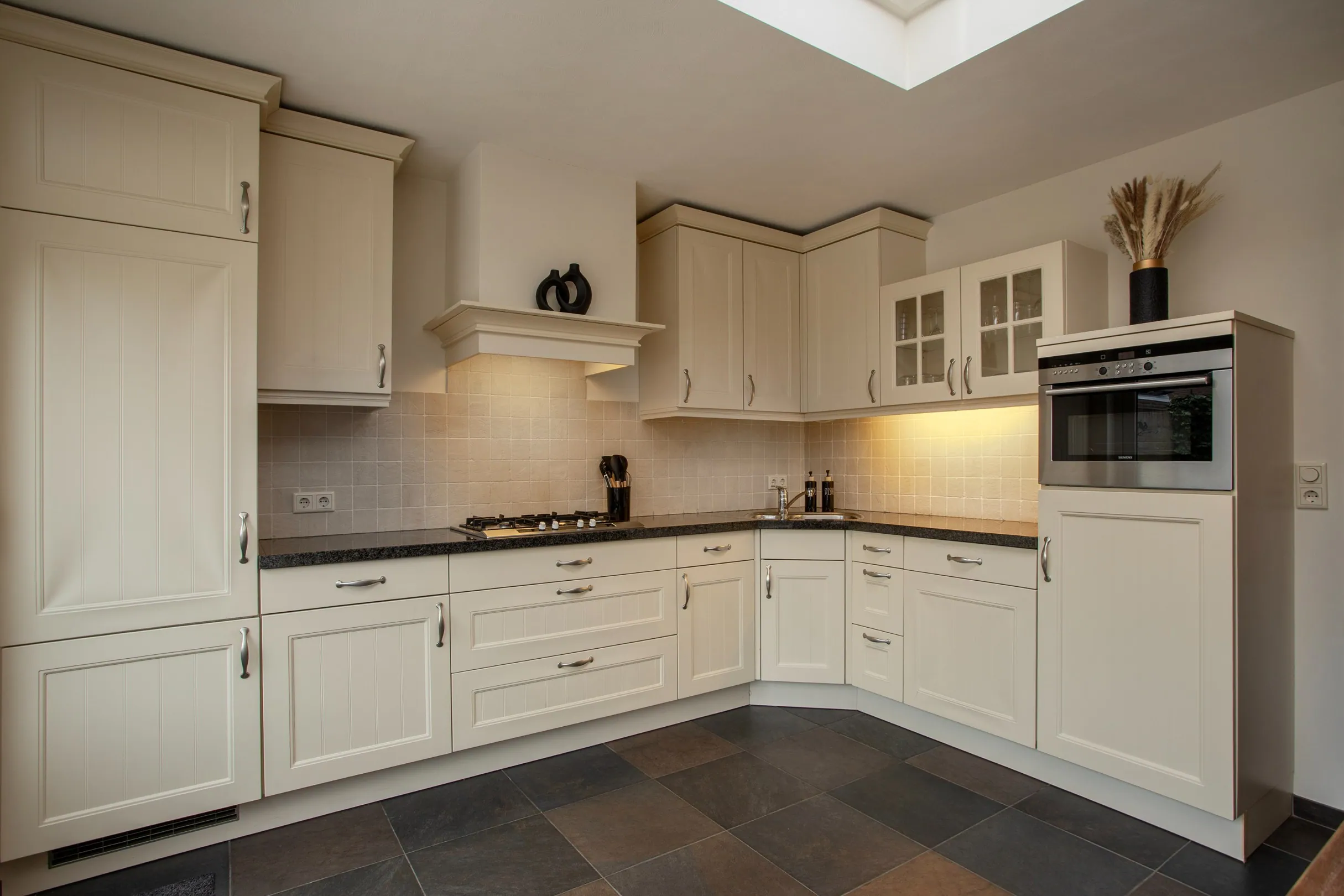 Aan de achterzijde bevindt zich de royale leefkeuken, gesitueerd in de uitbouw en bereikbaar via schuifdeuren met glas-in-lood. De keuken is ruim van opzet en biedt prettig zicht op de achtertuin via een groot raam. Extra daglicht komt binnen via de lichtkoepel en de ruimte is voorzien van vloerverwarming. De L-vormige keuken beschikt over een 4-pits gasfornuis met afzuigkap, koelkast, combi-oven en vaatwasser, en biedt volop werk- en bergruimte.