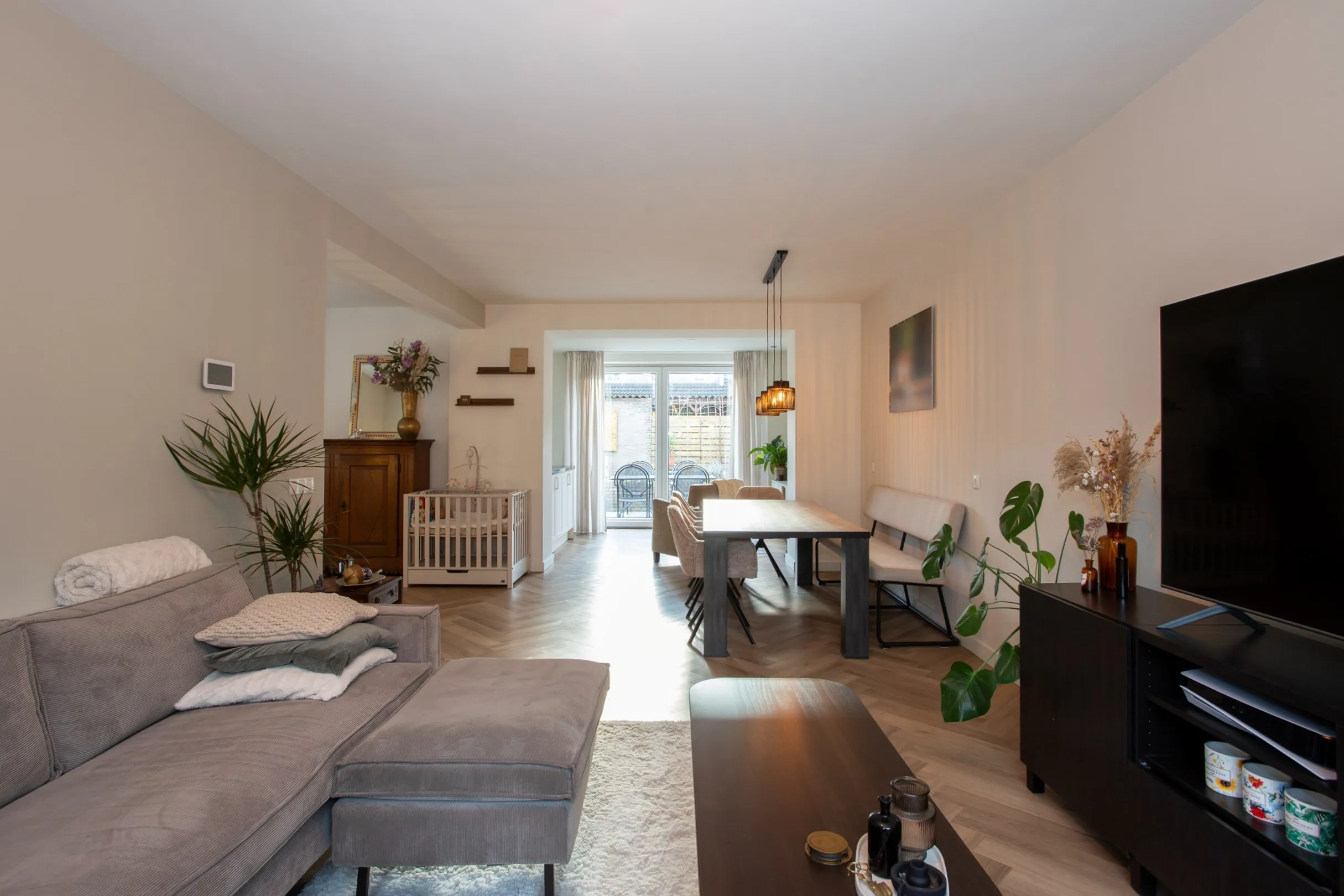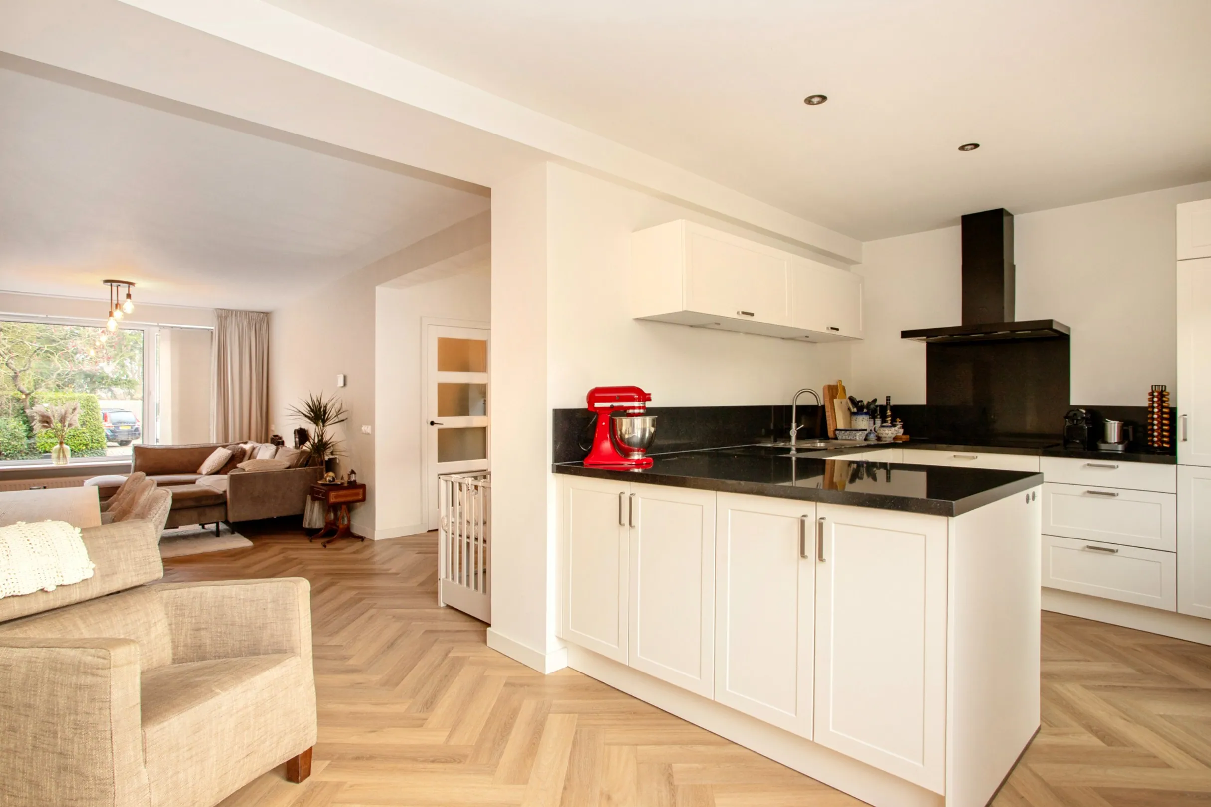 De ruime woonkamer is heerlijk licht door de grote ramen aan zowel de voor- als achterzijde. De ruimte is afgewerkt met een visgraat PVC vloer en strak gestuukte muren.