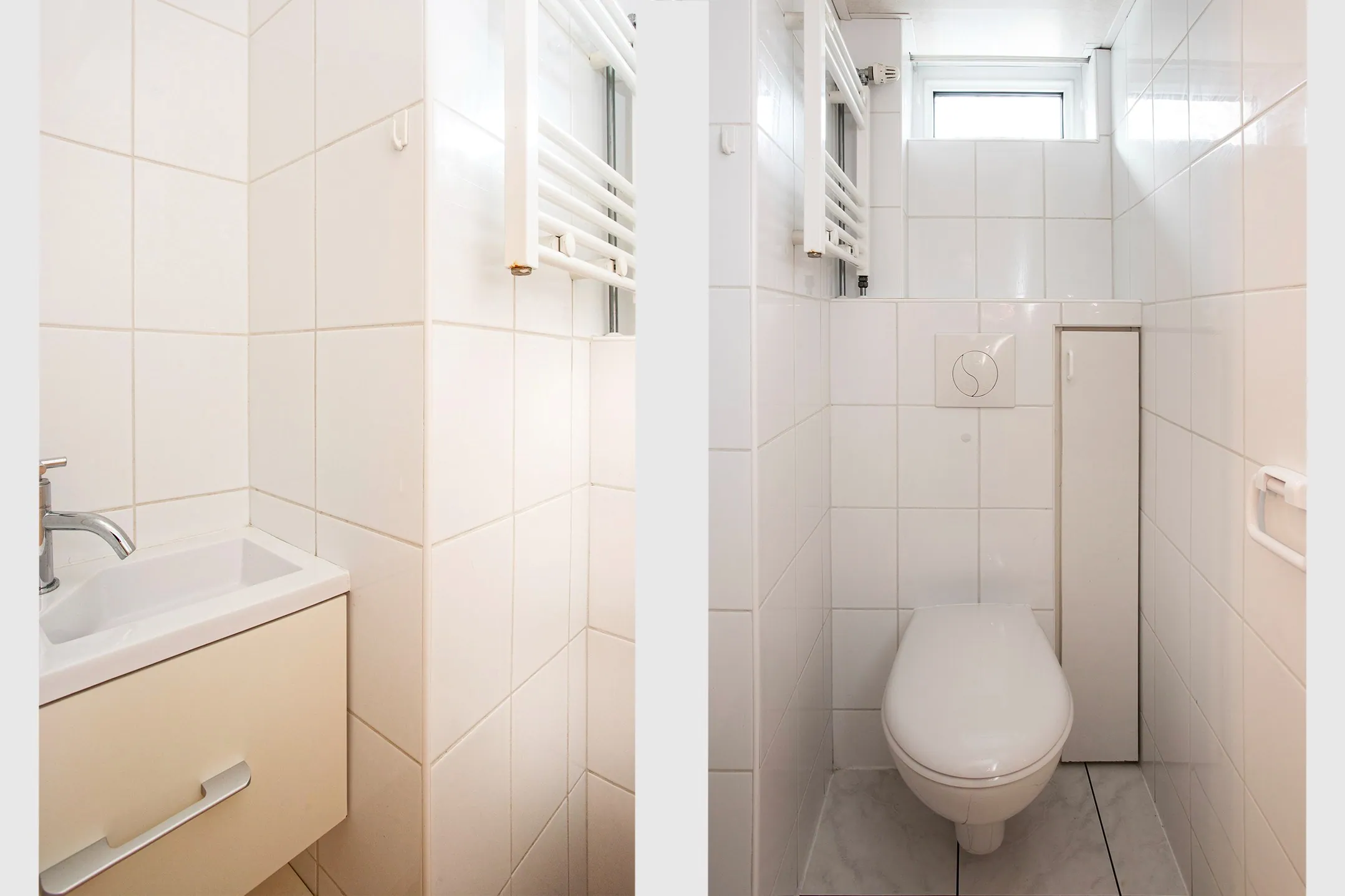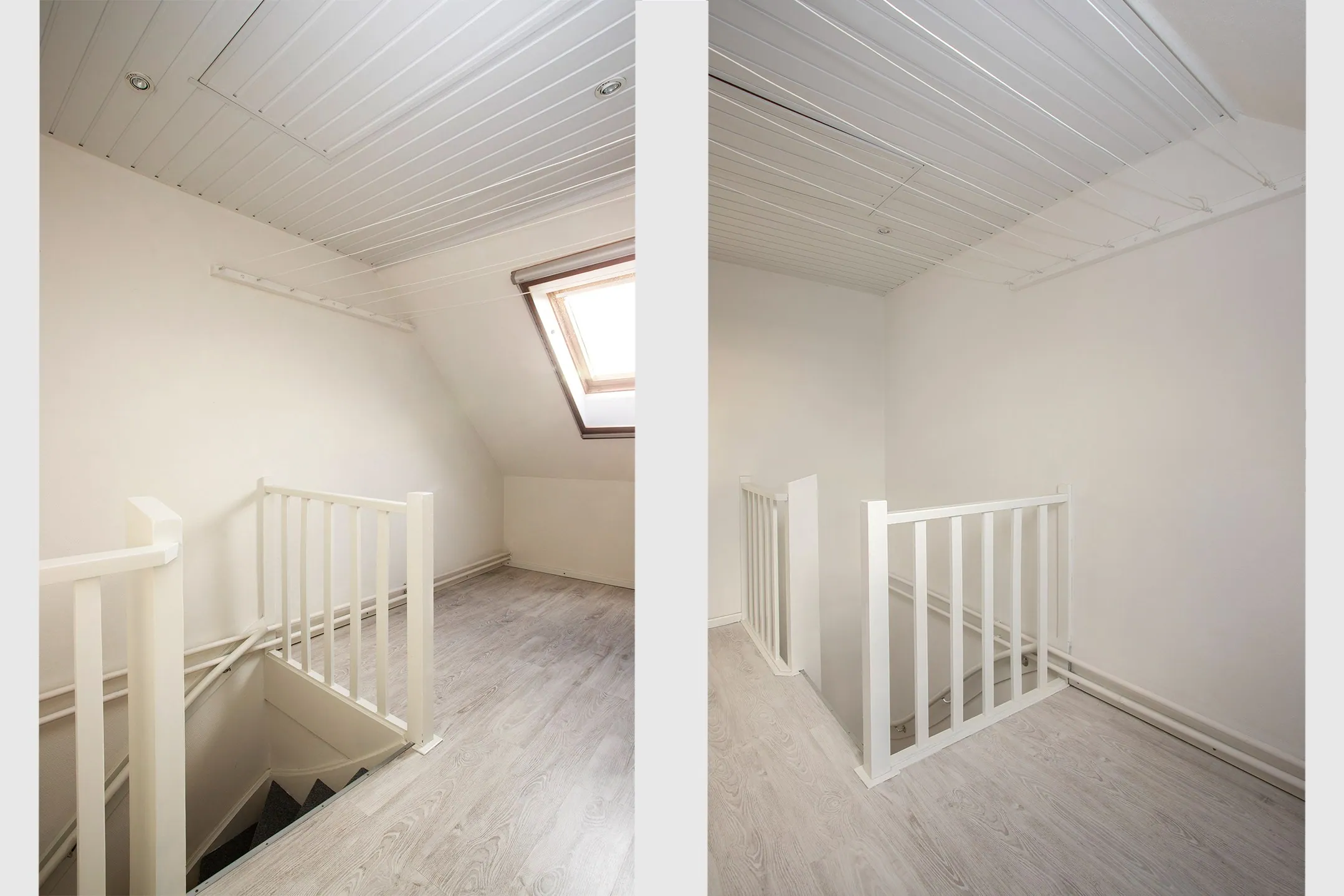 Via the staircase you reach the very spacious landing, fitted with a Velux roof window. From the landing there is access to a separate laundry/technical room housing the heating system and providing space for the washing machine and dryer. The floor in this room is tiled.