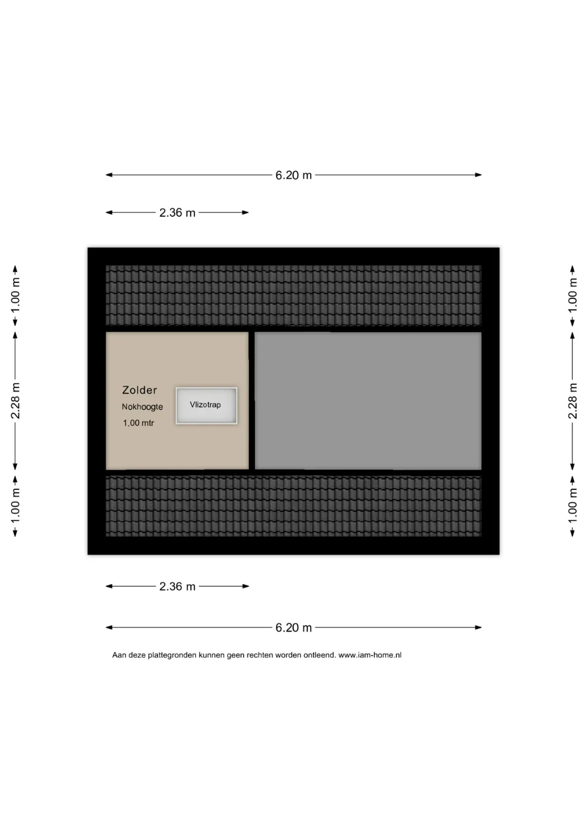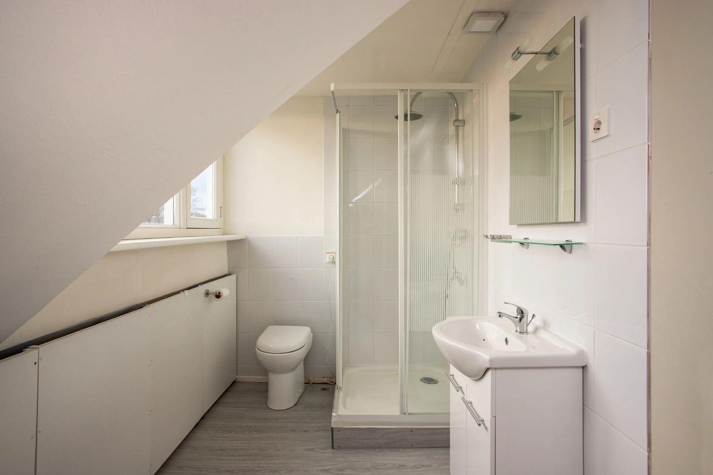 On this floor, at the front, there is a spacious bedroom with a dormer window. At the rear, there is a bathroom with shower, WC and washbasin. Beneath the dormer windows at both the front and rear, there are full-width storage areas.