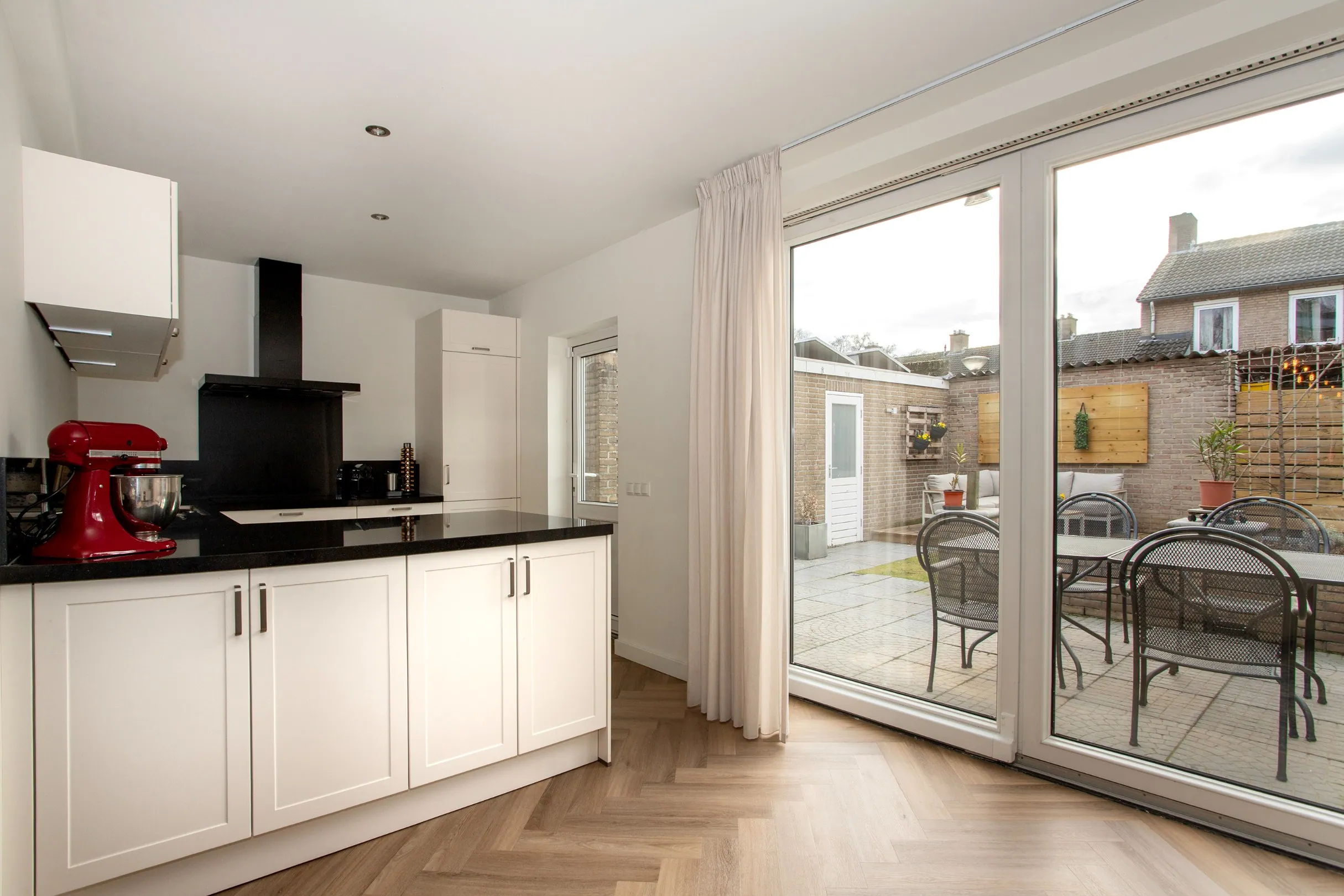 De moderne keuken, gerenoveerd in 2024, is uitgerust met inbouwapparatuur Bosch, zoals een vaatwasser, Quooker, oven, koelkast, en een inductiekookplaat. Het werkblad van Composit, in U-vorm, biedt volop werk- en opslagruimte. Dankzij de ramen aan de achterkant geniet je hier van veel licht en zicht op de tuin. Via de achterdeur of schuifpui kom je in de tuin.