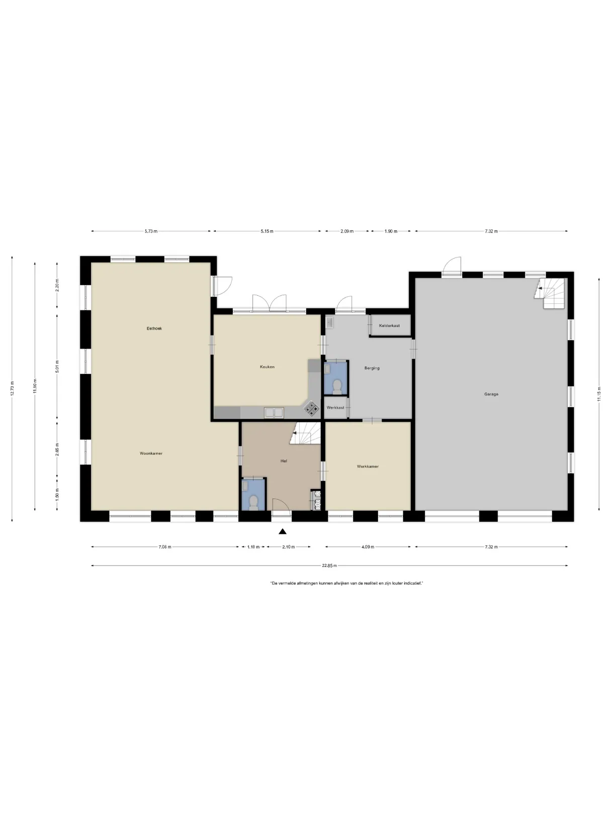 De berging met toilet, inbouwkasten en achteringang geeft toegang tot de grote garage (ruimte voor 4 auto’s) met elektrisch bedienbare poorten.