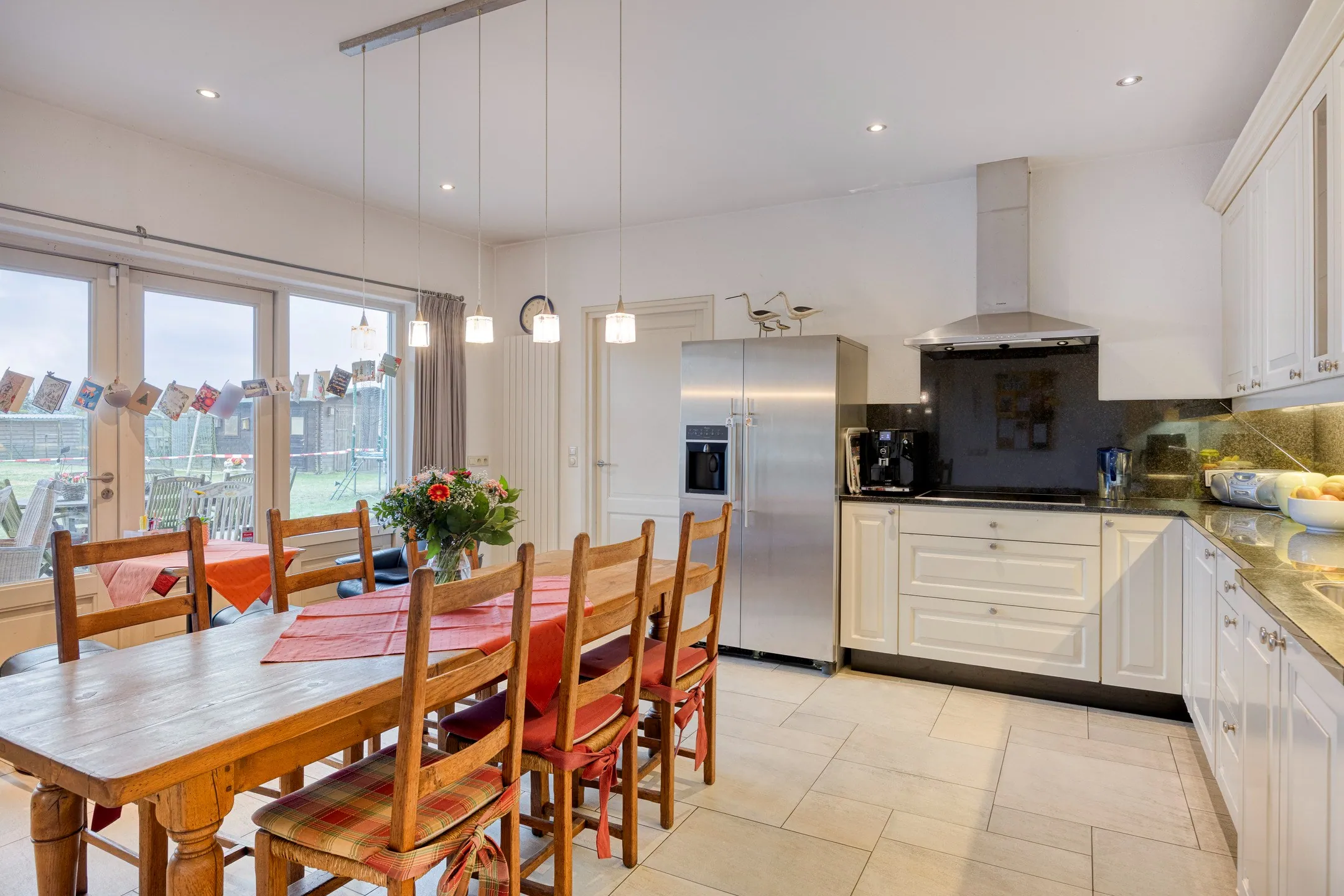Indeling: bij binnenkomst in de ruime inkomhal met gastentoilet treft men rechts een kantoor aan en links komt u in een lichtrijke woonkamer met vloerverwarming. Aansluitend ligt de volledig uitgeruste leefkeuken die uitmondt op het terras en de tuin.