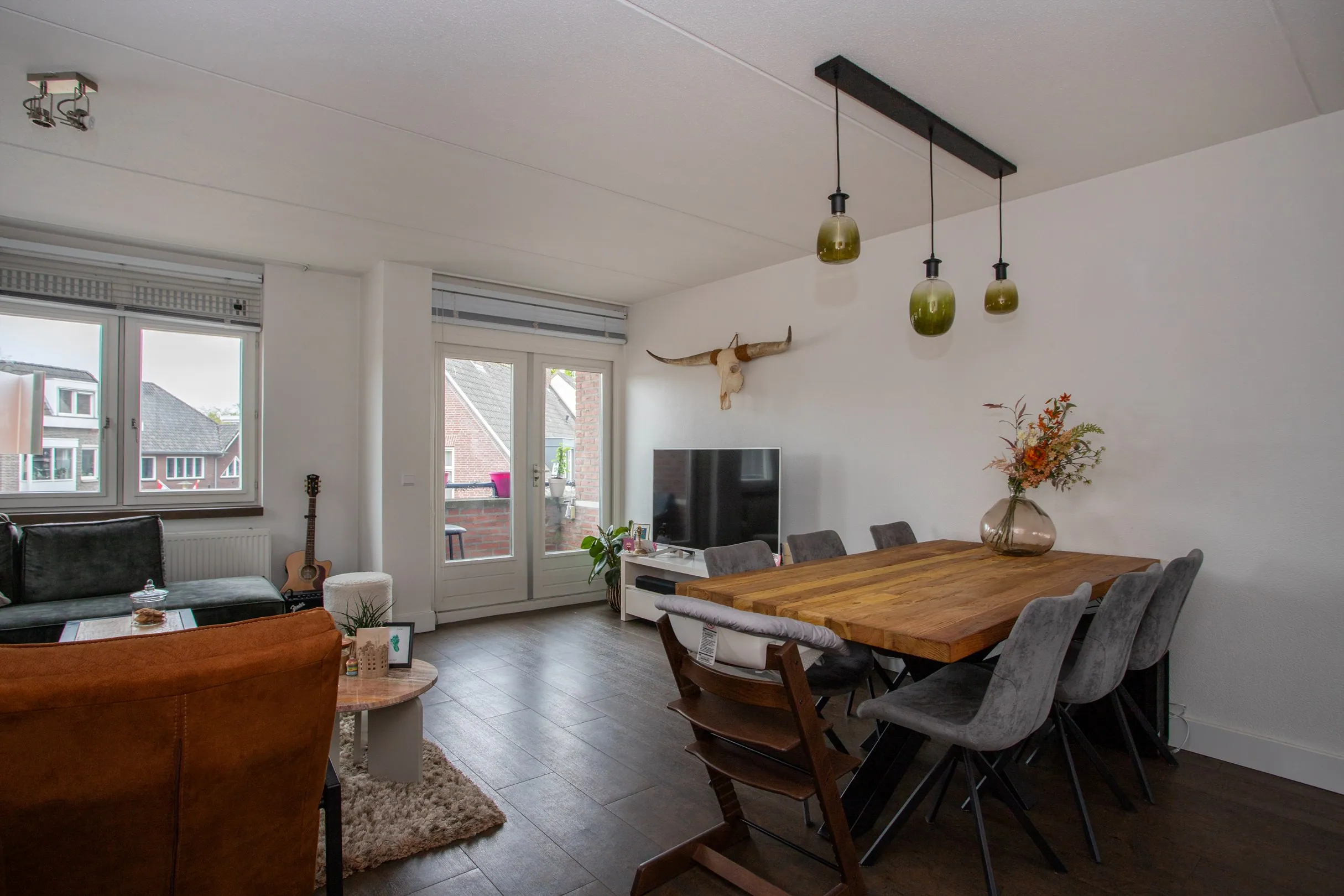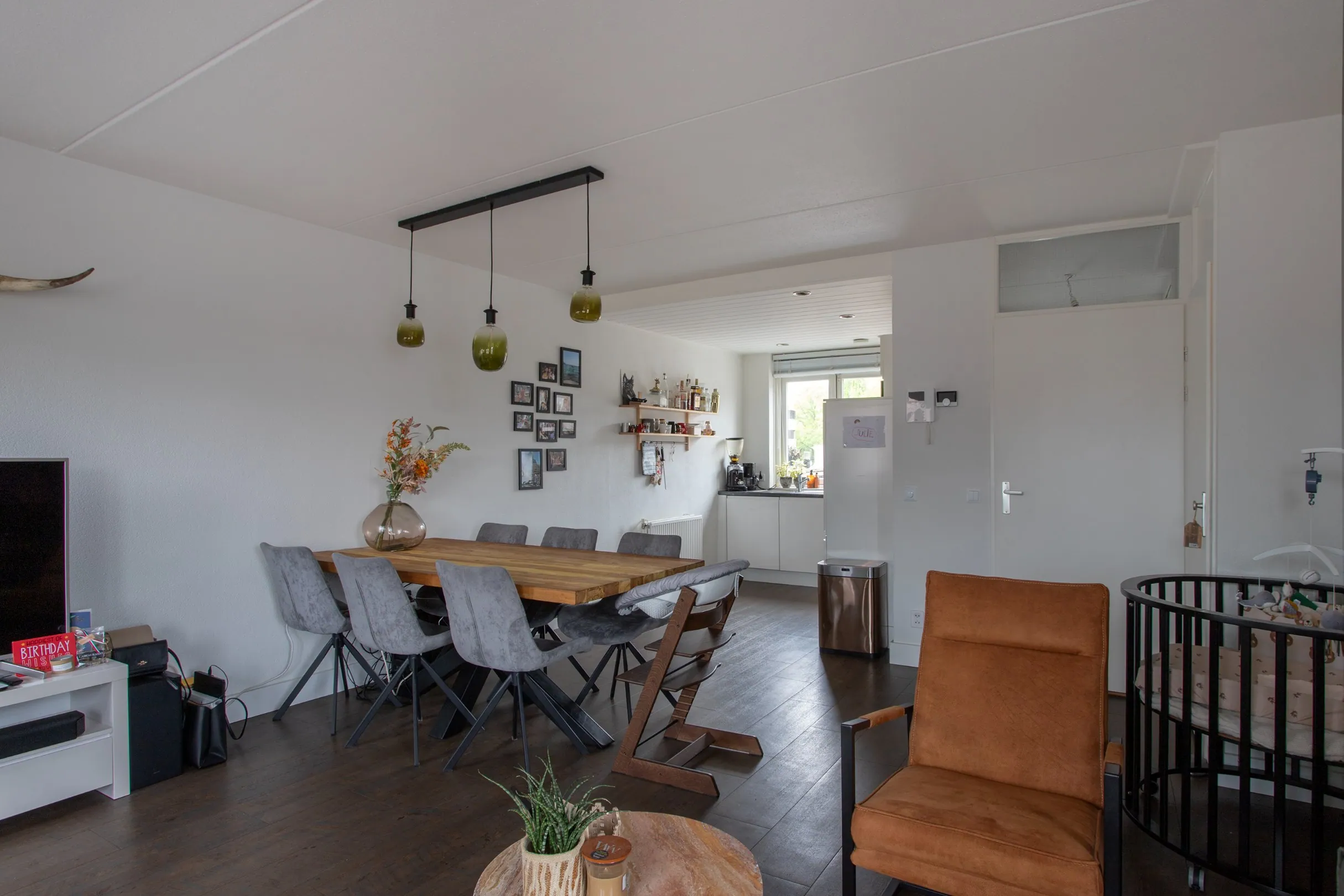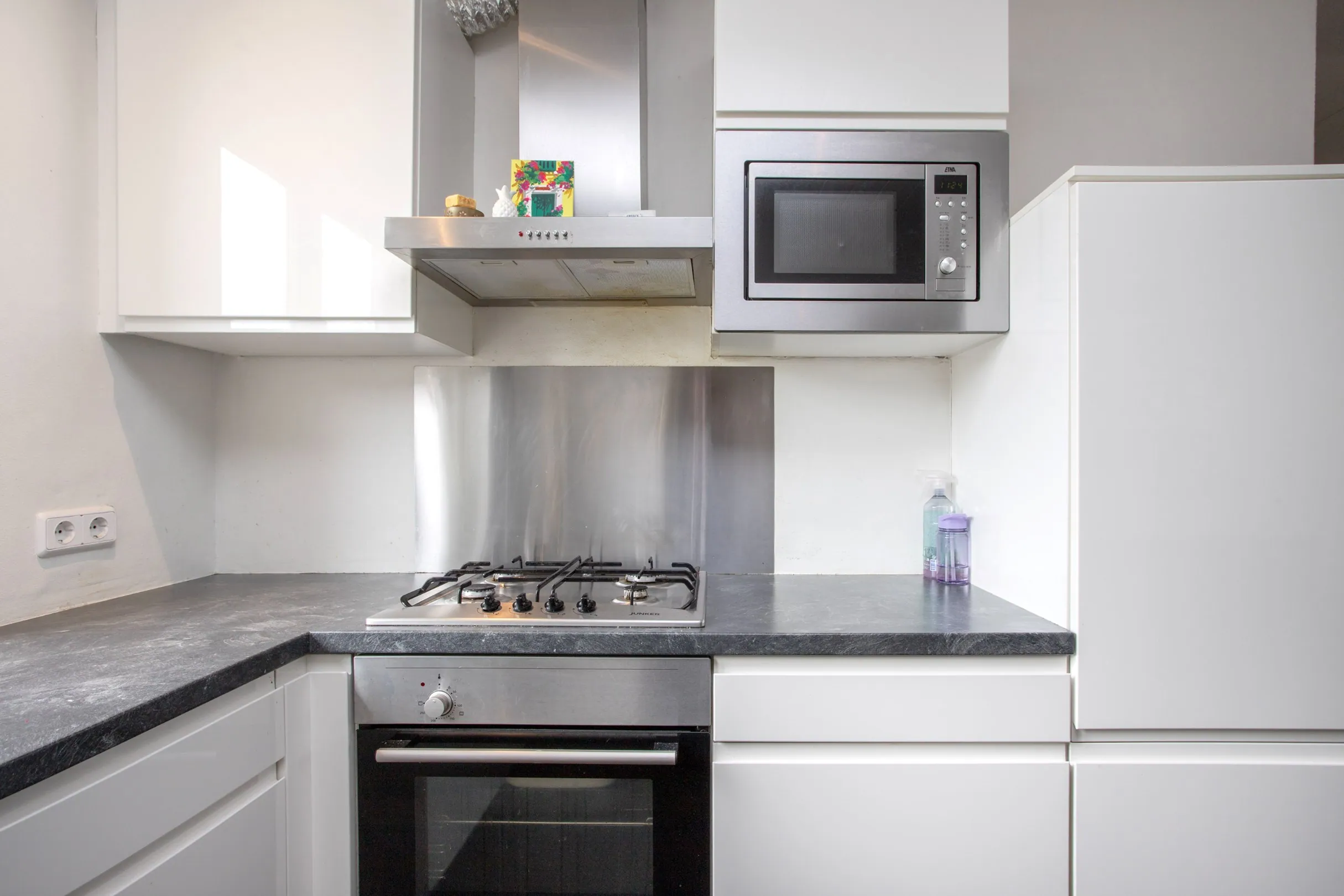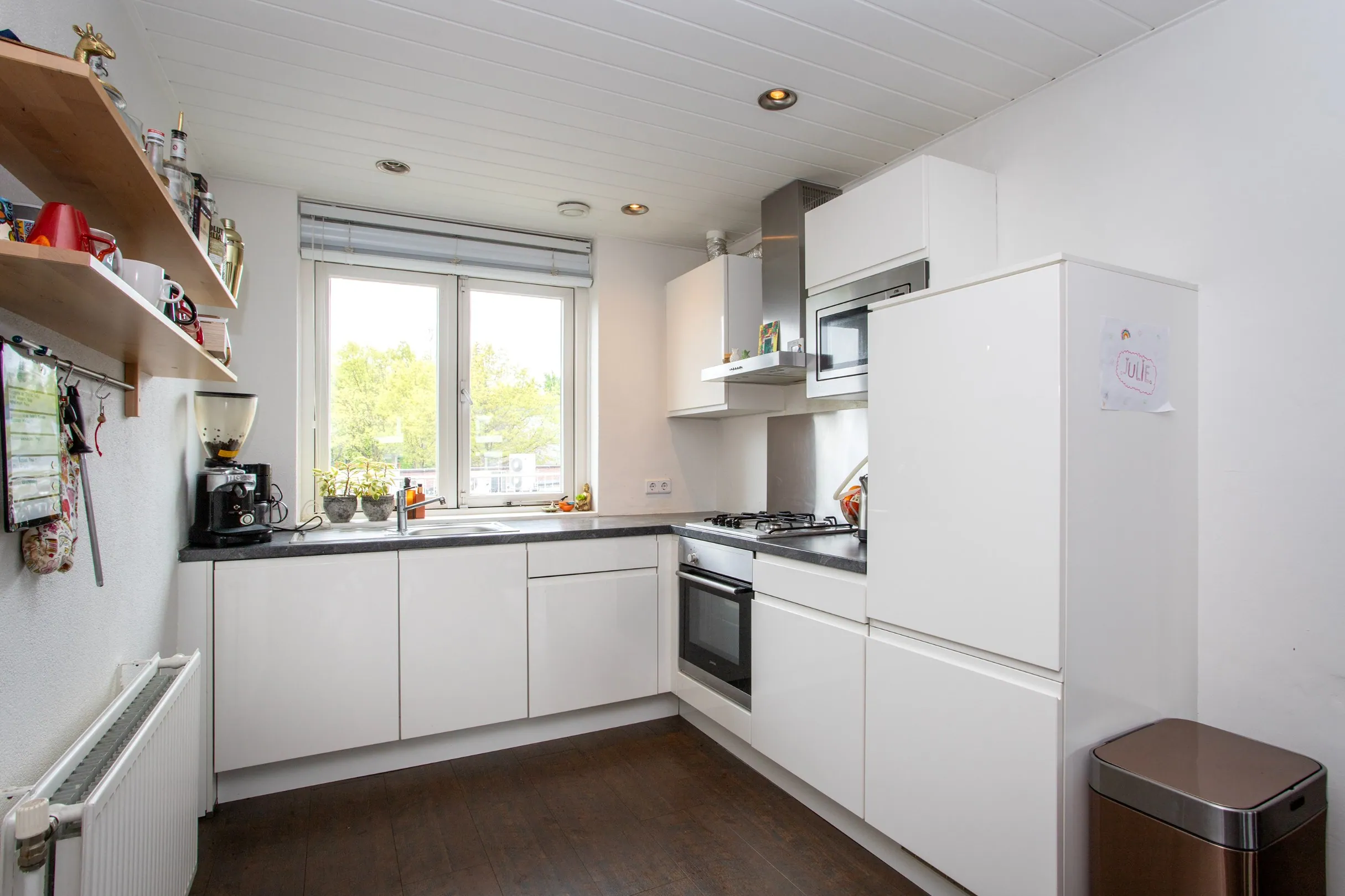 De lichte woonkamer heeft veel natuurlijk daglicht en goede ventilatiemogelijkheden. Openslaande deuren bieden toegang tot een klein balkon met zonneluifel, gesitueerd op het zuiden. In de woonkamer vindt u tevens een handige trapkast. De open keuken is uitgerust met een RVS spoelbak, 4-pits gasstel, afzuigkap, combimagnetron, oven, koelkast, vaatwasser, kunststof werkblad en veel opbergruimte. Ook hier is sprake van natuurlijke lichtinval en ventilatie.