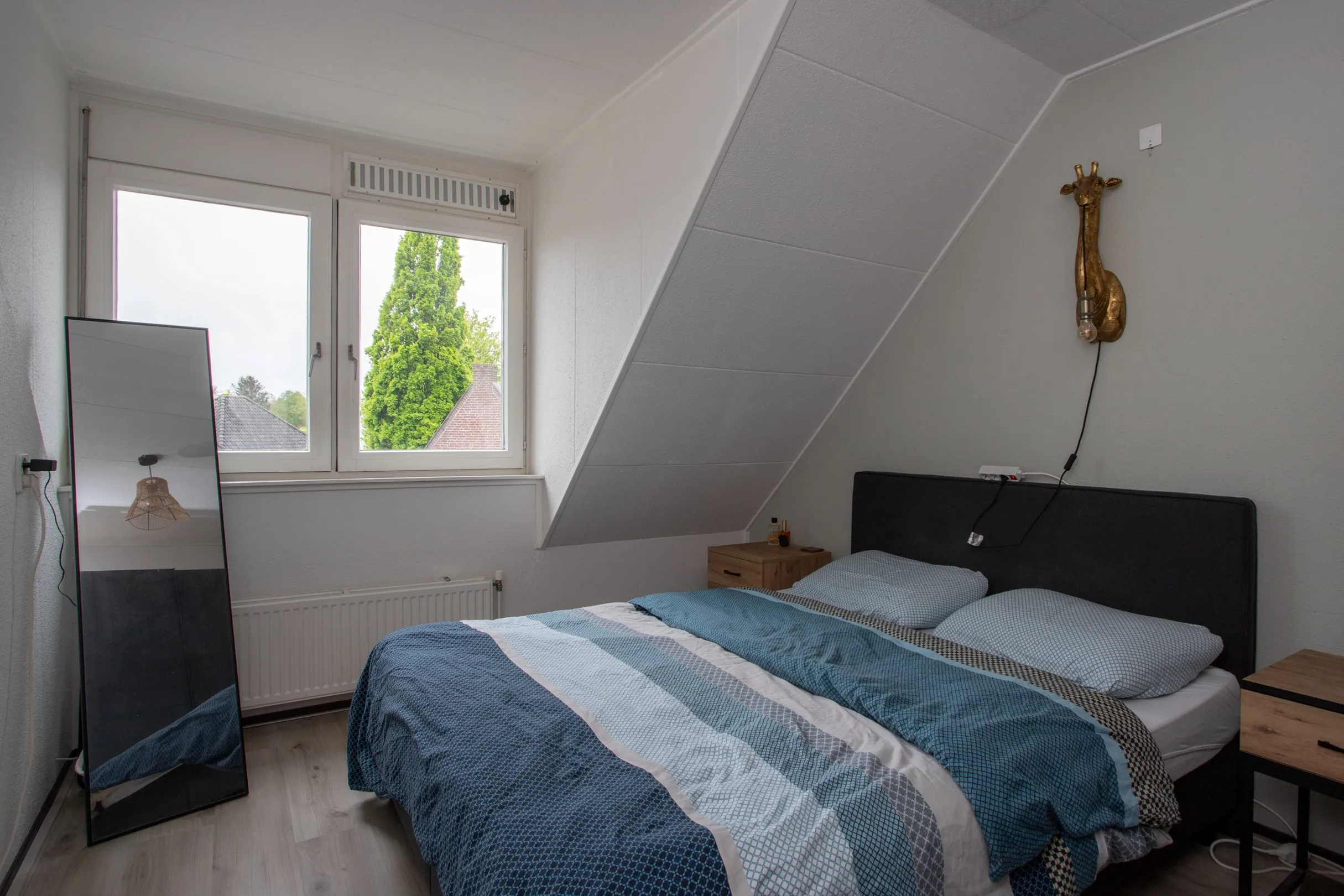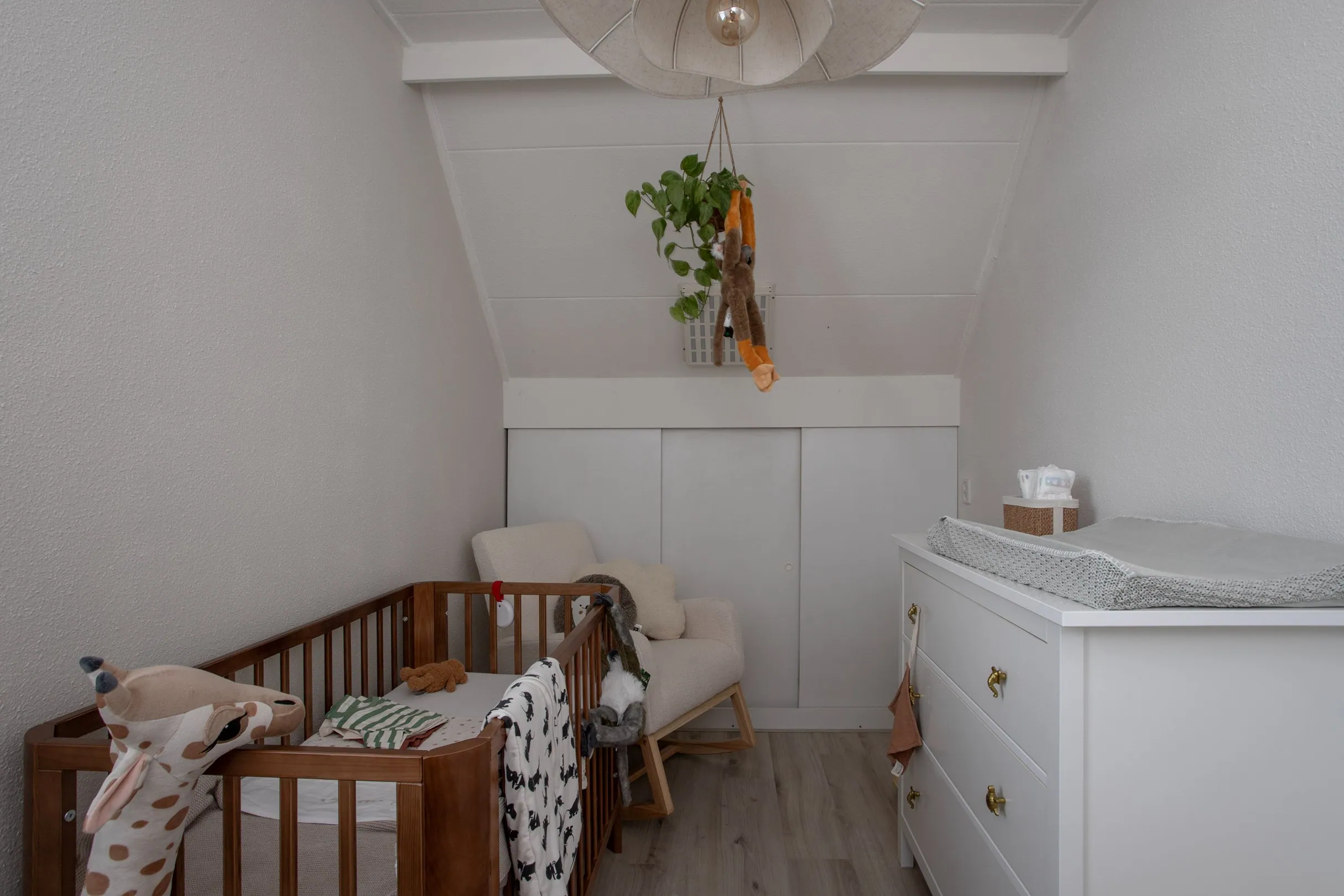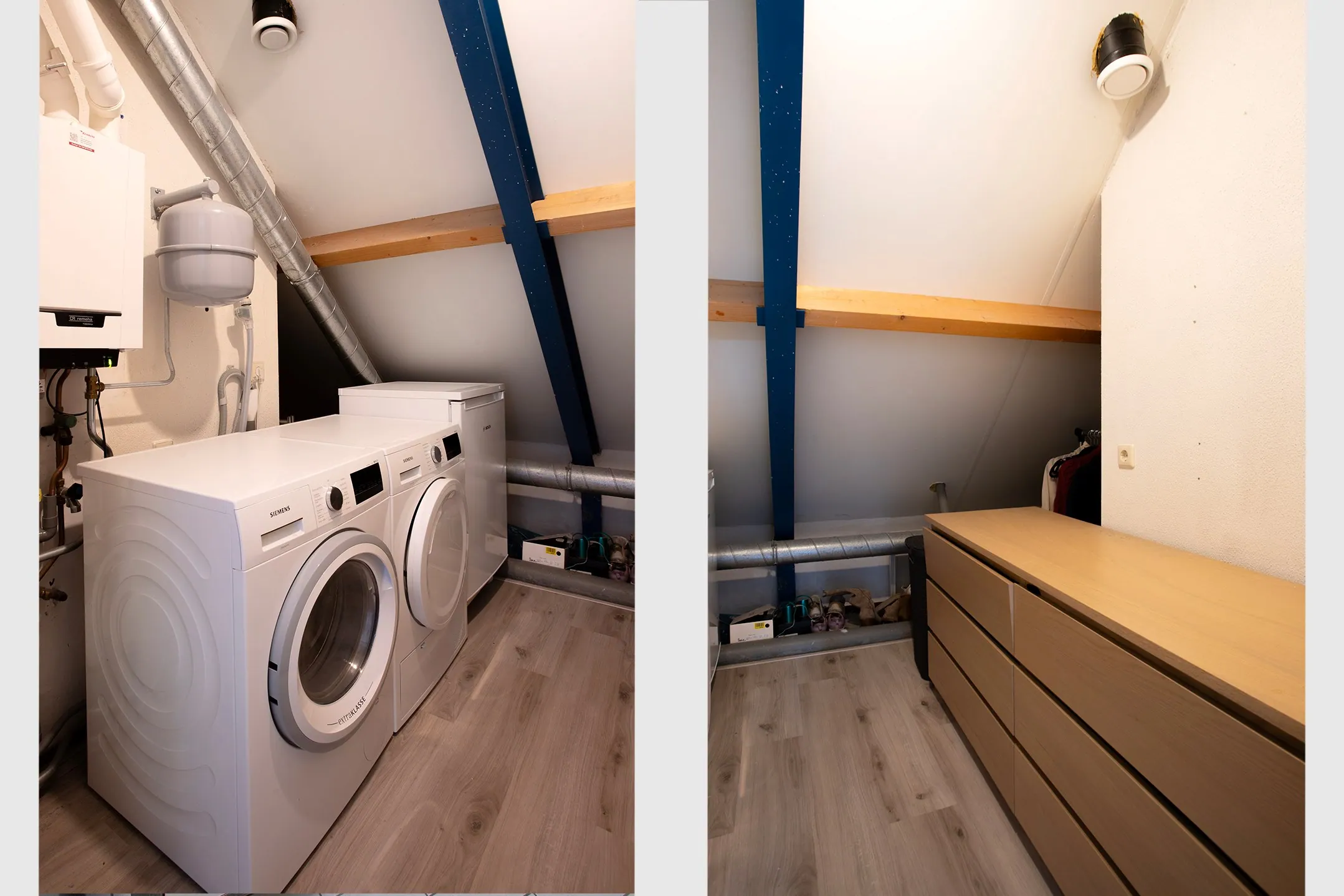 Via de trap in de gang bereikt u de overloop van de slaapverdieping. Hier bevinden zich twee slaapkamers, een ruime badkamer en een technische ruimte. Beide slaapkamers beschikken over daglicht en ventilatie. Eén van de kamers heeft daarnaast extra kastruimte onder de schuine kap.