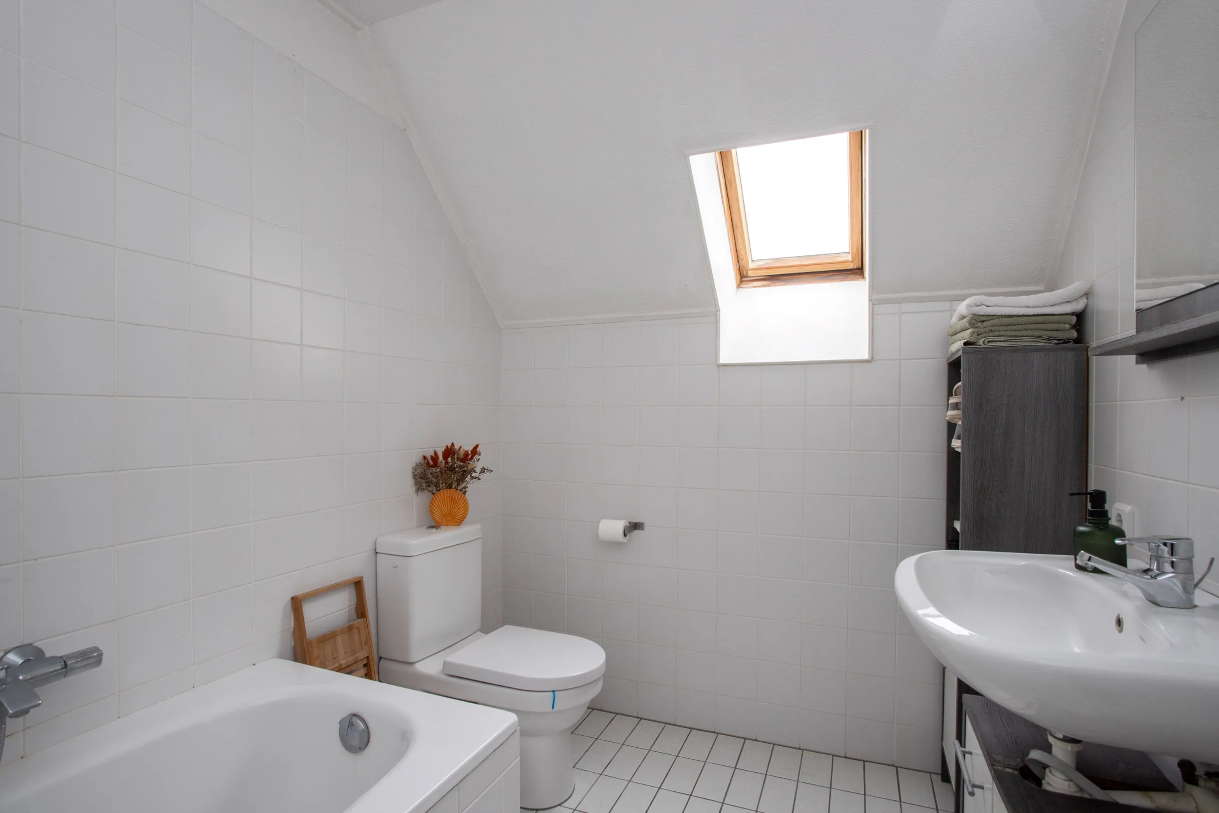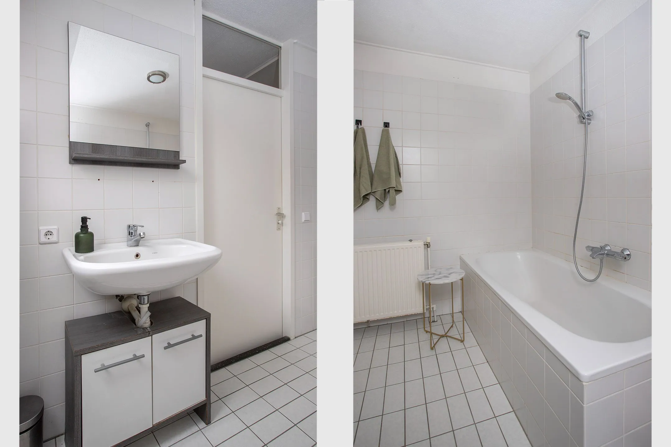 De badkamer is voorzien van een ligbad, een wastafel en een tweede toilet, en beschikt ook over daglicht en ventilatie. In de technische ruimte zijn de aansluitingen voor wasmachine en droger te vinden, evenals de CV-installatie (REMEHA Tzerra, 2018).