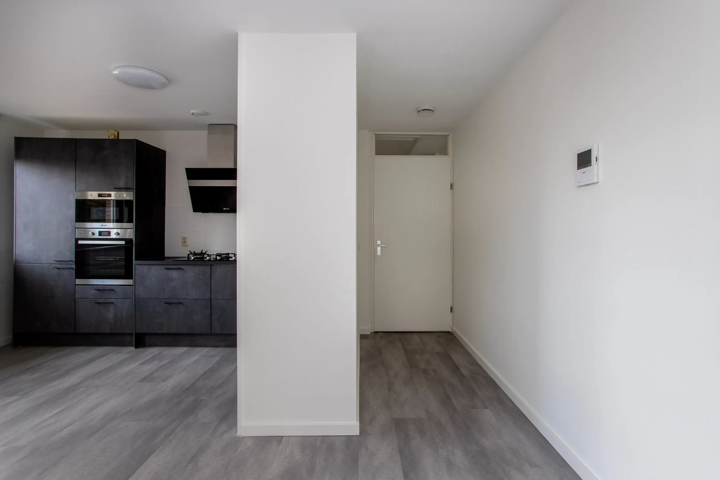 • De woonkamer is royaal en voorzien van twee openslaande deuren naar een Frans balkon. Het uitzicht is levendig zonder dat er sprake is van drukte of geluidsoverlast in de woning. Een lichte fijne leefruimte.