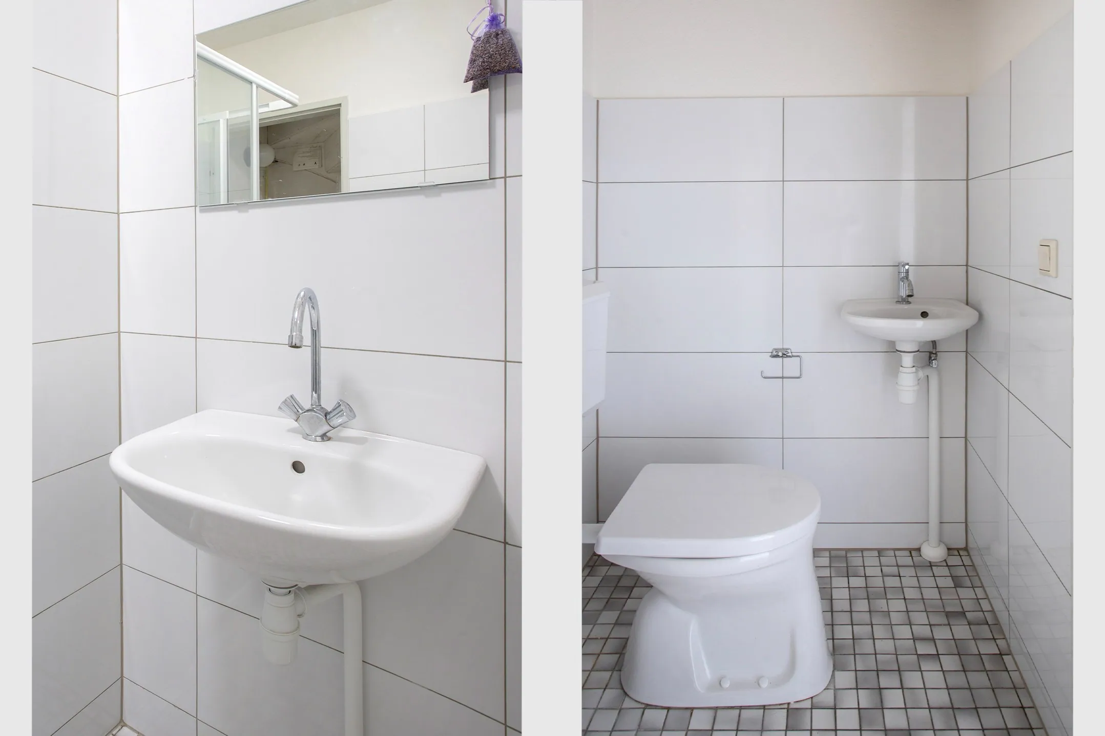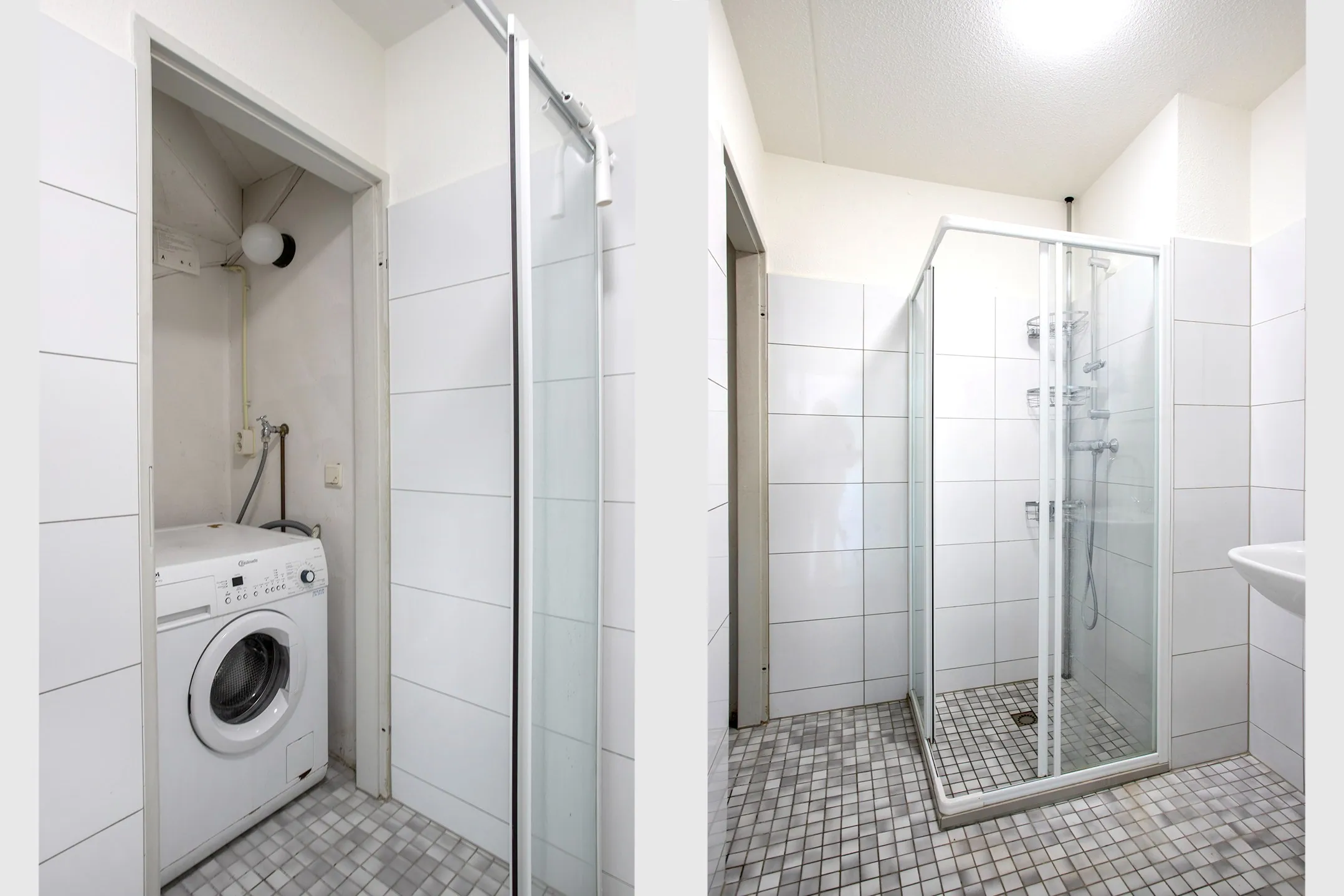 Vanuit de woonkamer gaat u naar een naastgelegen tussenportaal. Vanuit dit portaal heeft u toegang tot de badkamer met inloopdouche en vaste wastafel. In de badkamer bevinden zich tevens aansluitingen voor de wasmachine en droger. Vanuit het tussenportaal is het separate toilet met fonteintje bereikbaar, evenals een van de beide slaapkamers. Deze slaapkamer heeft ook natuurlijke lichtinval en ventilatie.