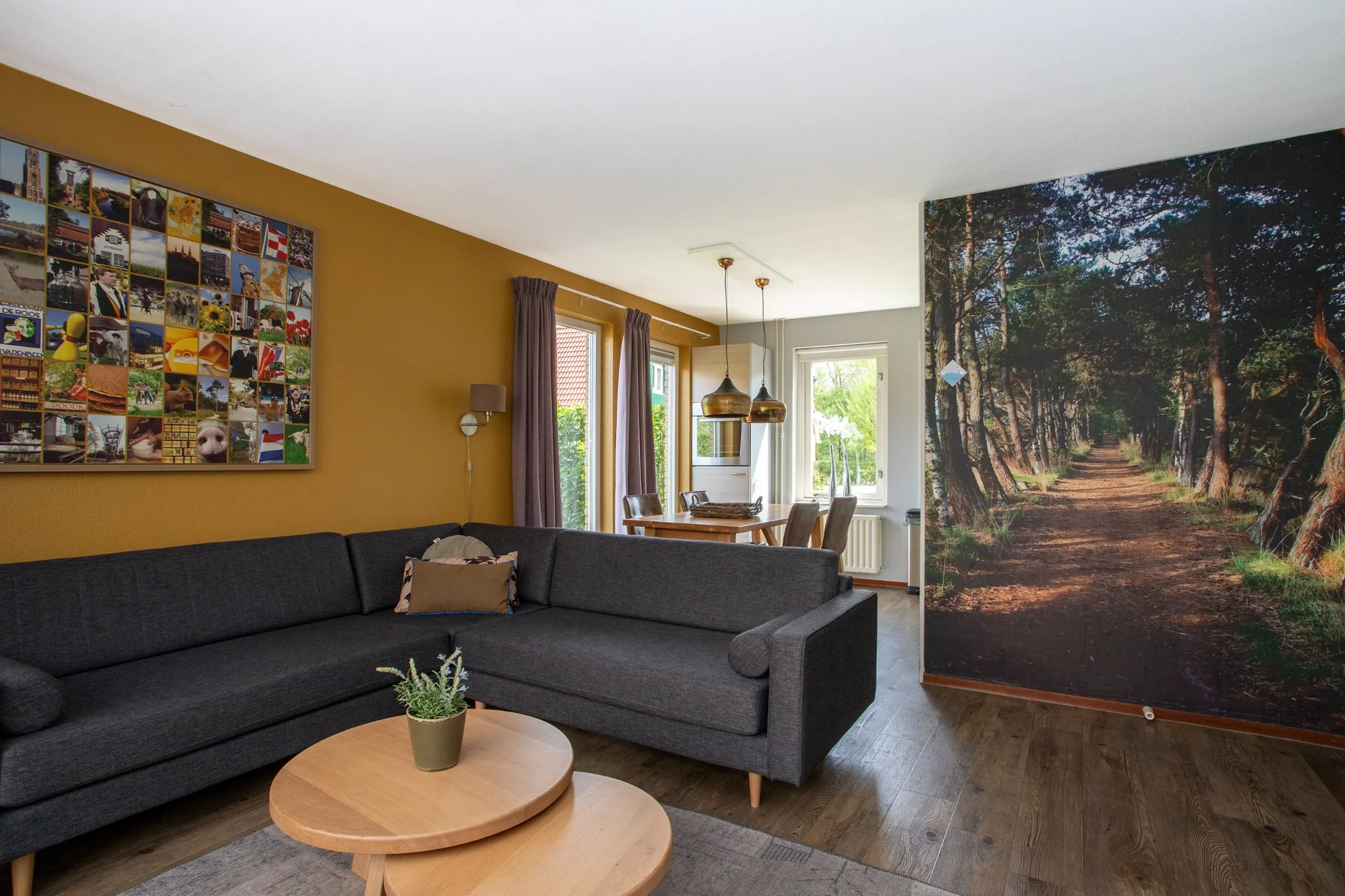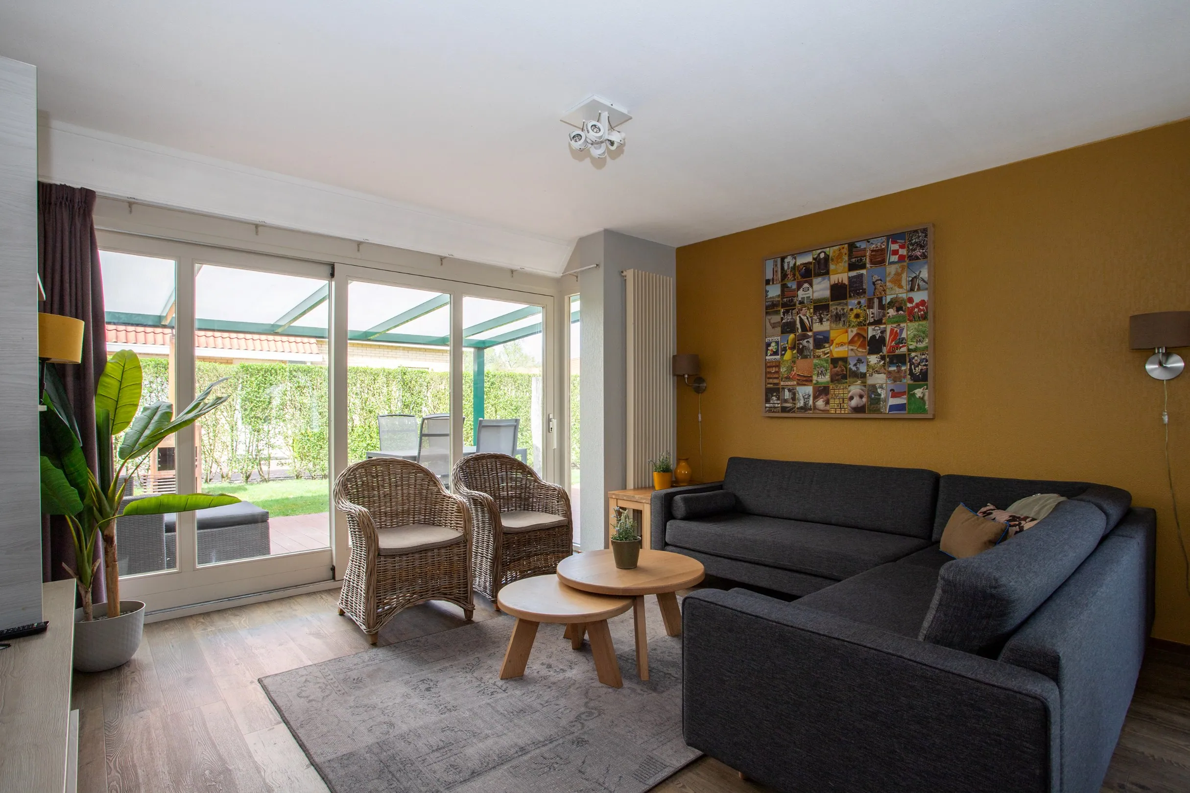 - Sfeervolle woonkamer met veel lichtinval en schuifpui naar het overdekte terras