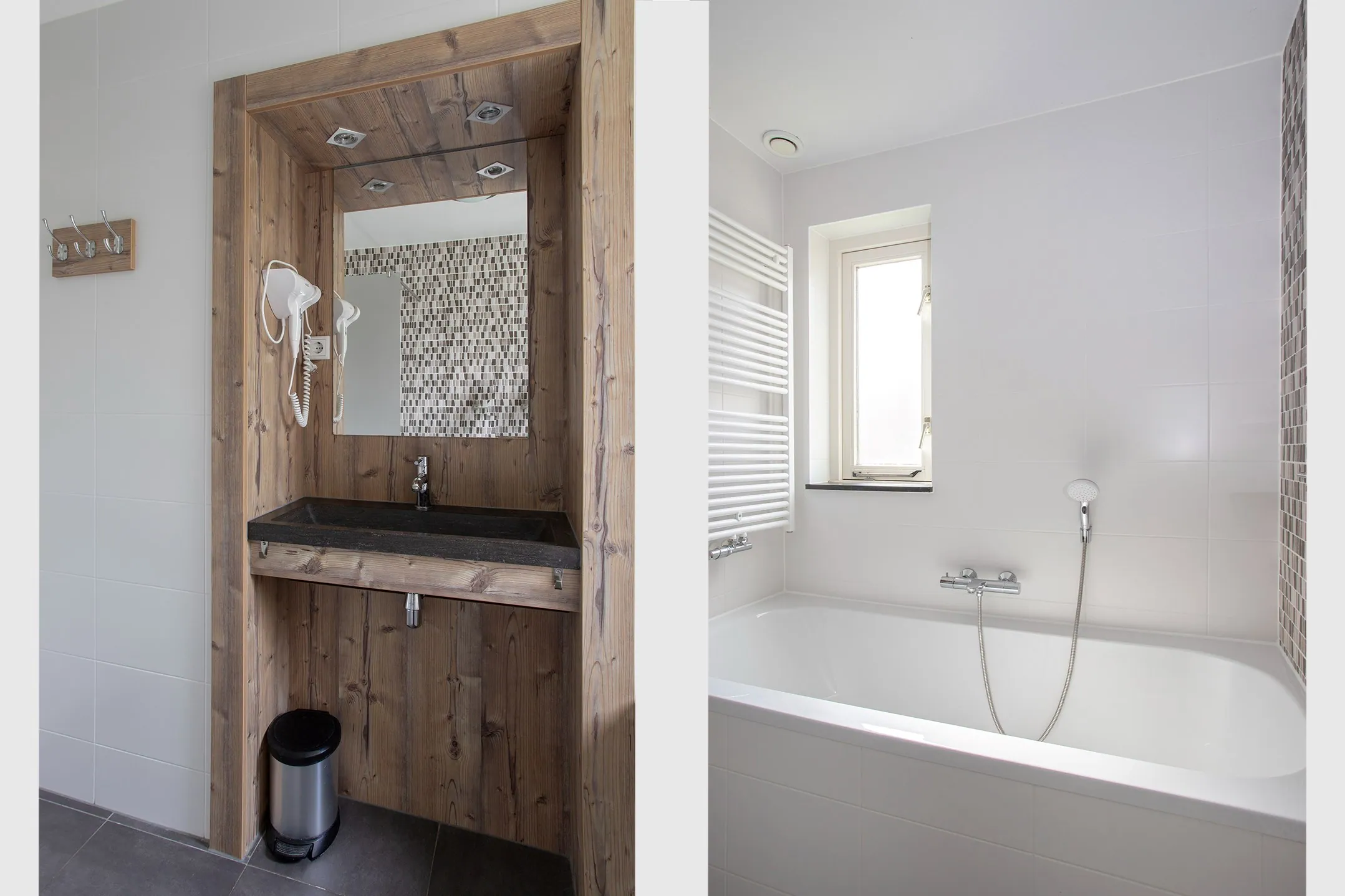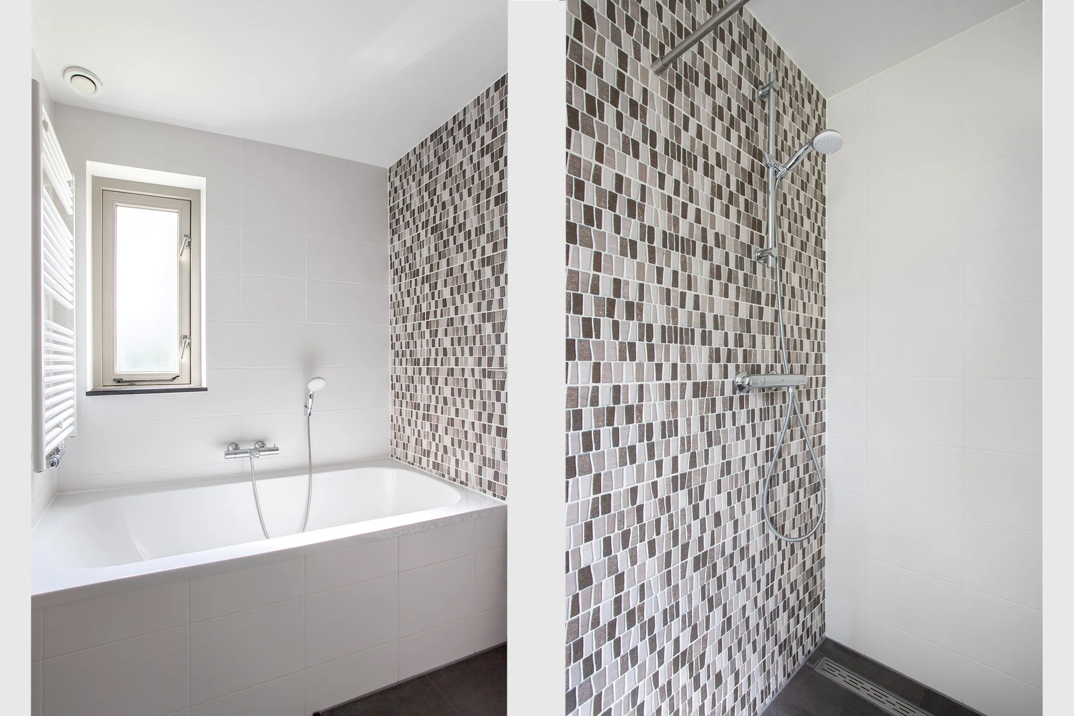 - Moderne, volledig betegelde badkamer met ligbad, douche en wastafel