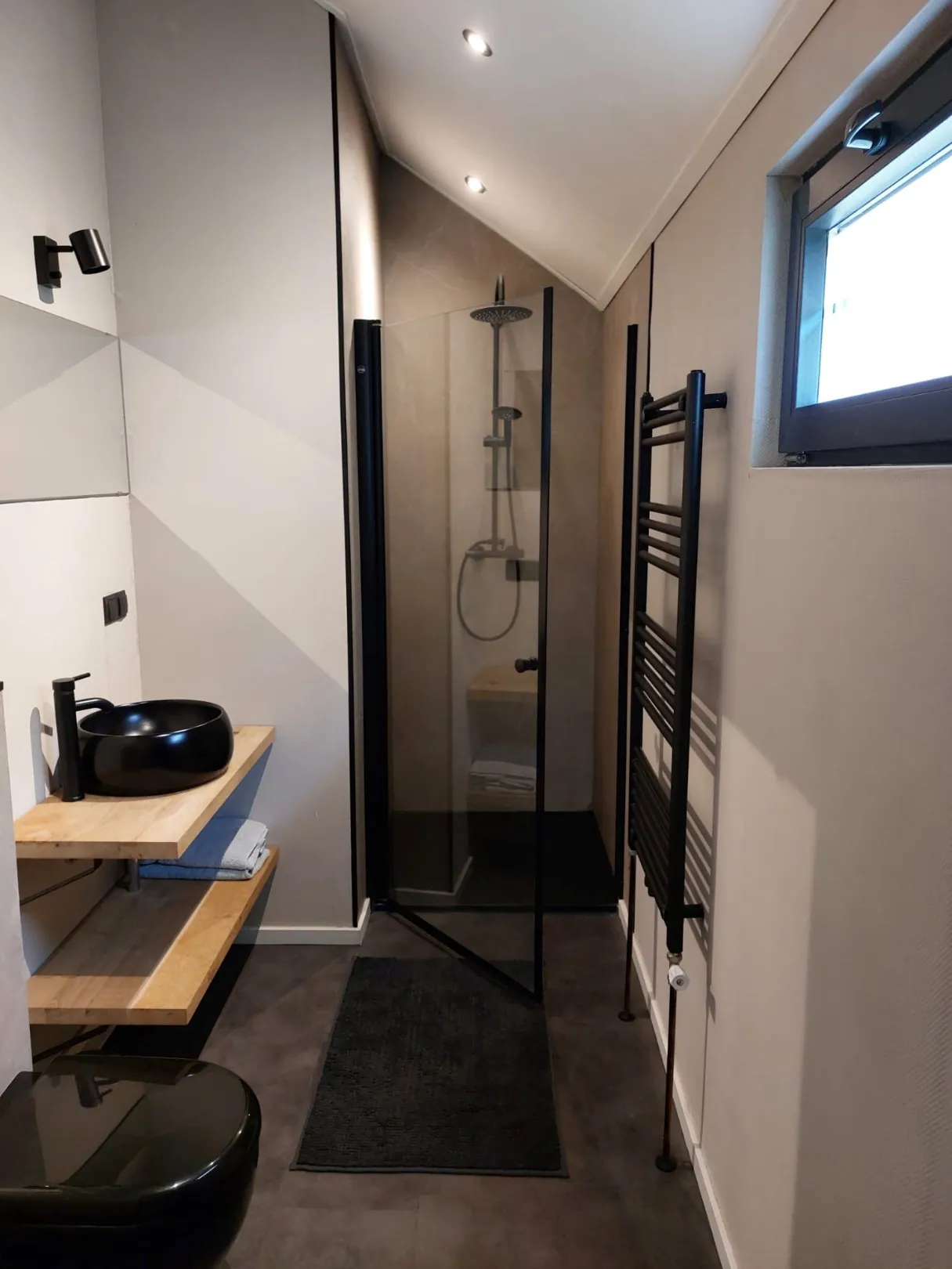 U betreedt het chalet via de entree welke toegang biedt tot de woonkamer met open keuken, 2 slaapkamers en de badkamer. De woonkamer is voorzien van een fraaie visgraat-zeil vloer, grote ramen die zorgen voor meer dan voldoende lichtinval. Alle ramen zijn tevens zijn voorzien van luxaflex. De woonkamer voelt erg ruim aan door de hoogte van het dak. De open keuken is voorzien van een koelkast, inductie kookplaat, vaatwasser en combi-oven. Via de keuken betreedt u de 2 slaapkamers en de badkamer. De slaapkamers zijn beide van prima formaat. De badkamer is zeer modern ingericht en voorzien van een inloopdouche, hangend toilet, wastafel en radiator. Al het sanitair is in de kleur zwart uitgevoerd wat een modern aanzicht geeft.