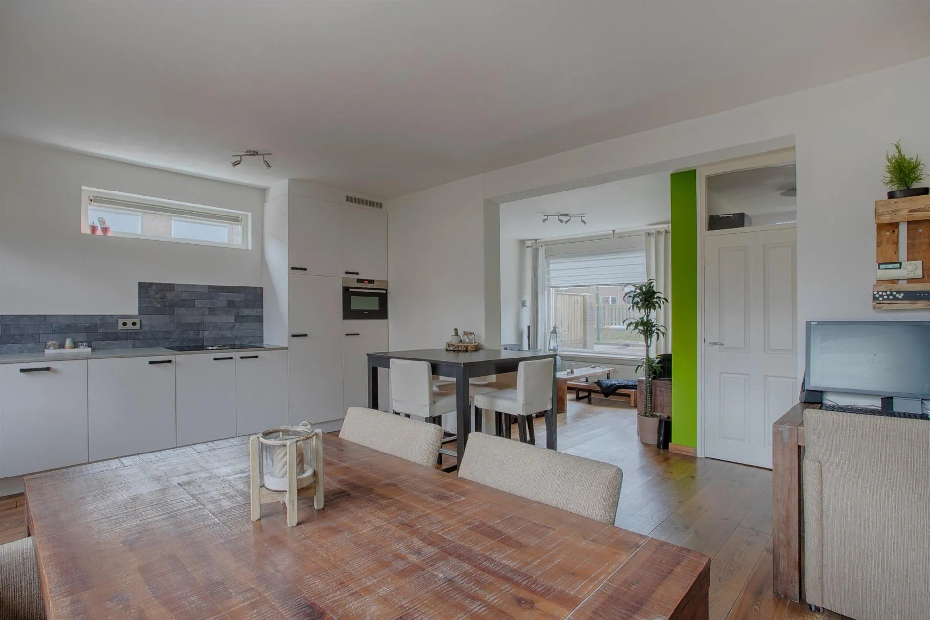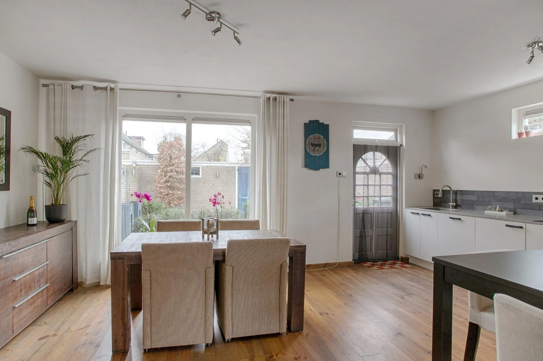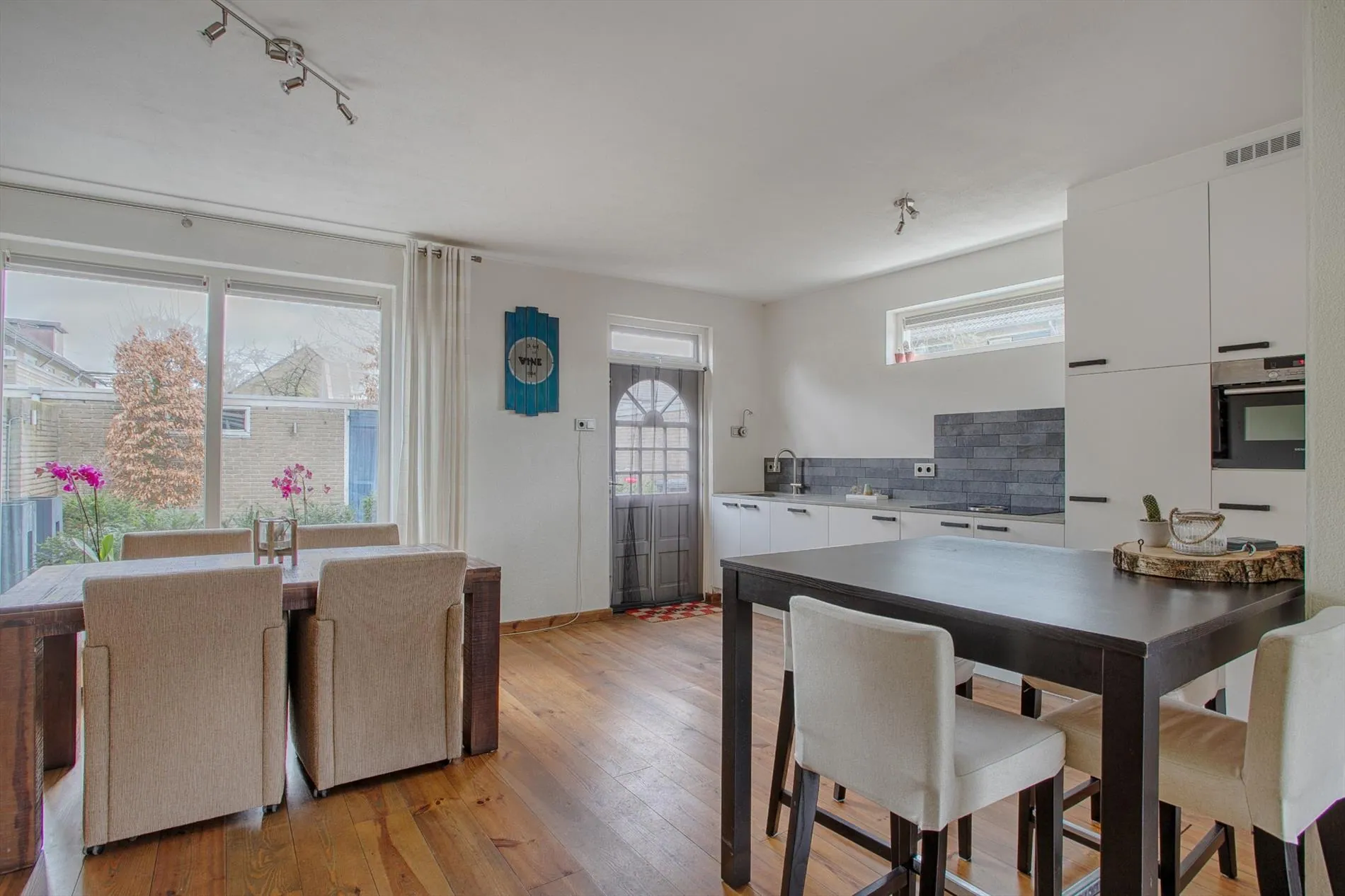 Woonkamer: de Z-woonkamer en keuken lopen in elkaar over. Aan de voorkant de zithoek en aan de achterkant de eethoek met open keuken. De hele ruimte is voorzien van een karakteristieke houten vloer (2009). De wanden zijn van schuurwerk/strak gestukt en de plafonds zijn strak gestukt/gespoten. Aan de achterzijde is een nieuw kunststof raam geplaatst wat zorgt voor extra lichtinval en een mooie kijk op de tuin.