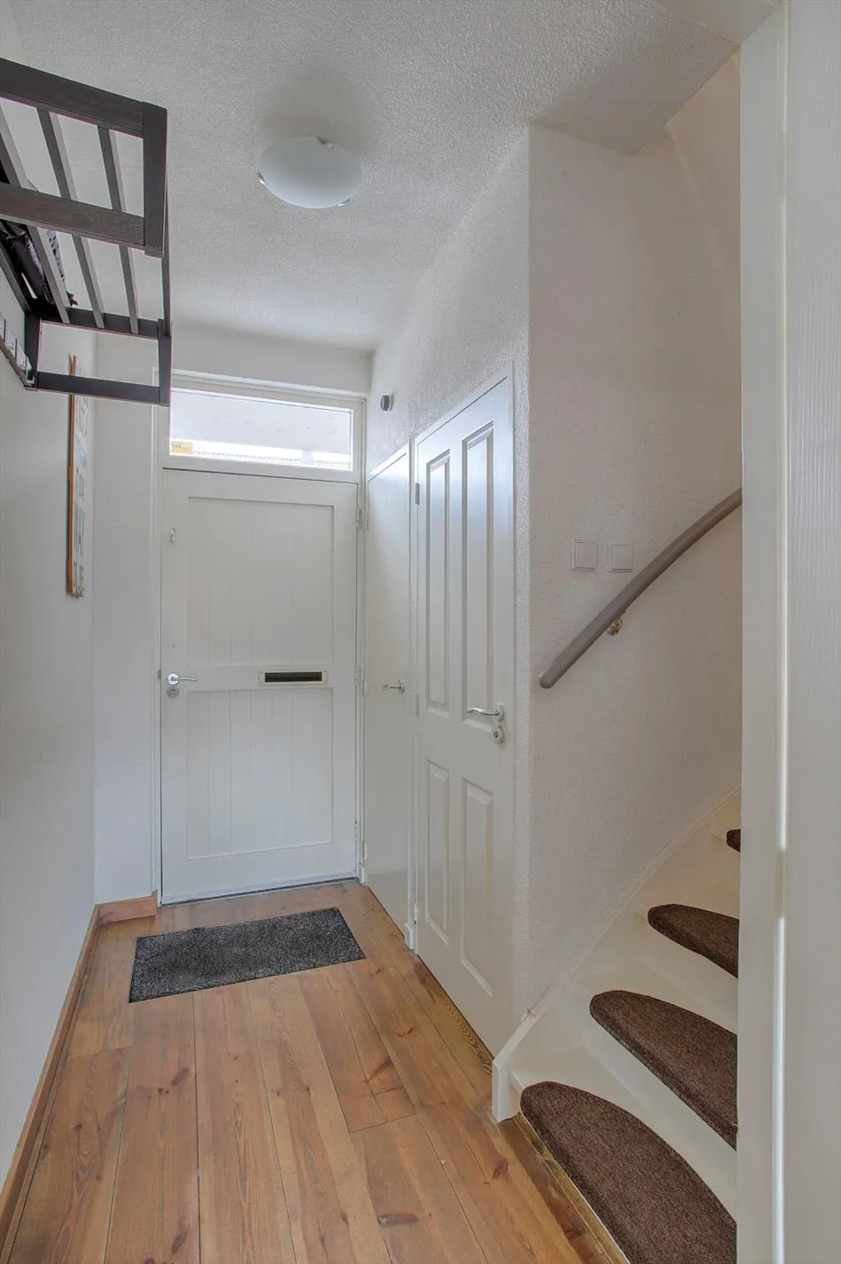 Via de voordeur kom je binnen in de hal van de woning die toegang geeft tot de woonkamer, toilet (halfhoog betegeld, fonteintje, natuurlijke ventilatie), de gemoderniseerde meterkast (9 groepen, 2 aardlekschakelaars) en de trap naar de 1e verdieping.