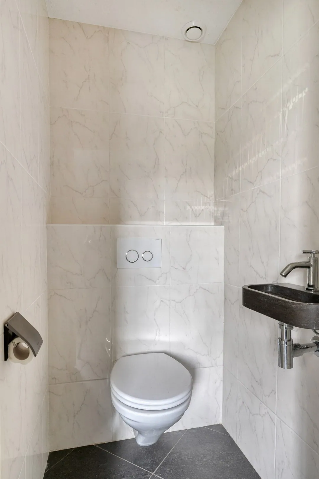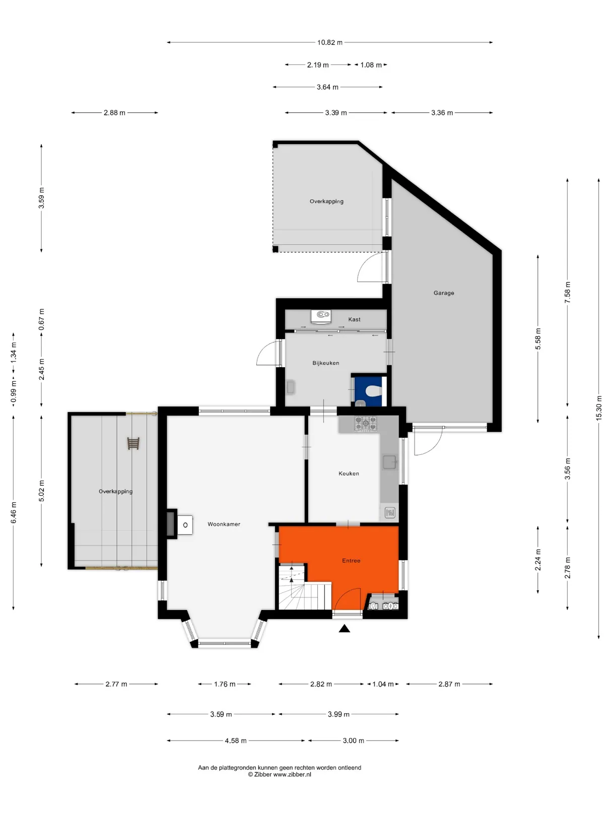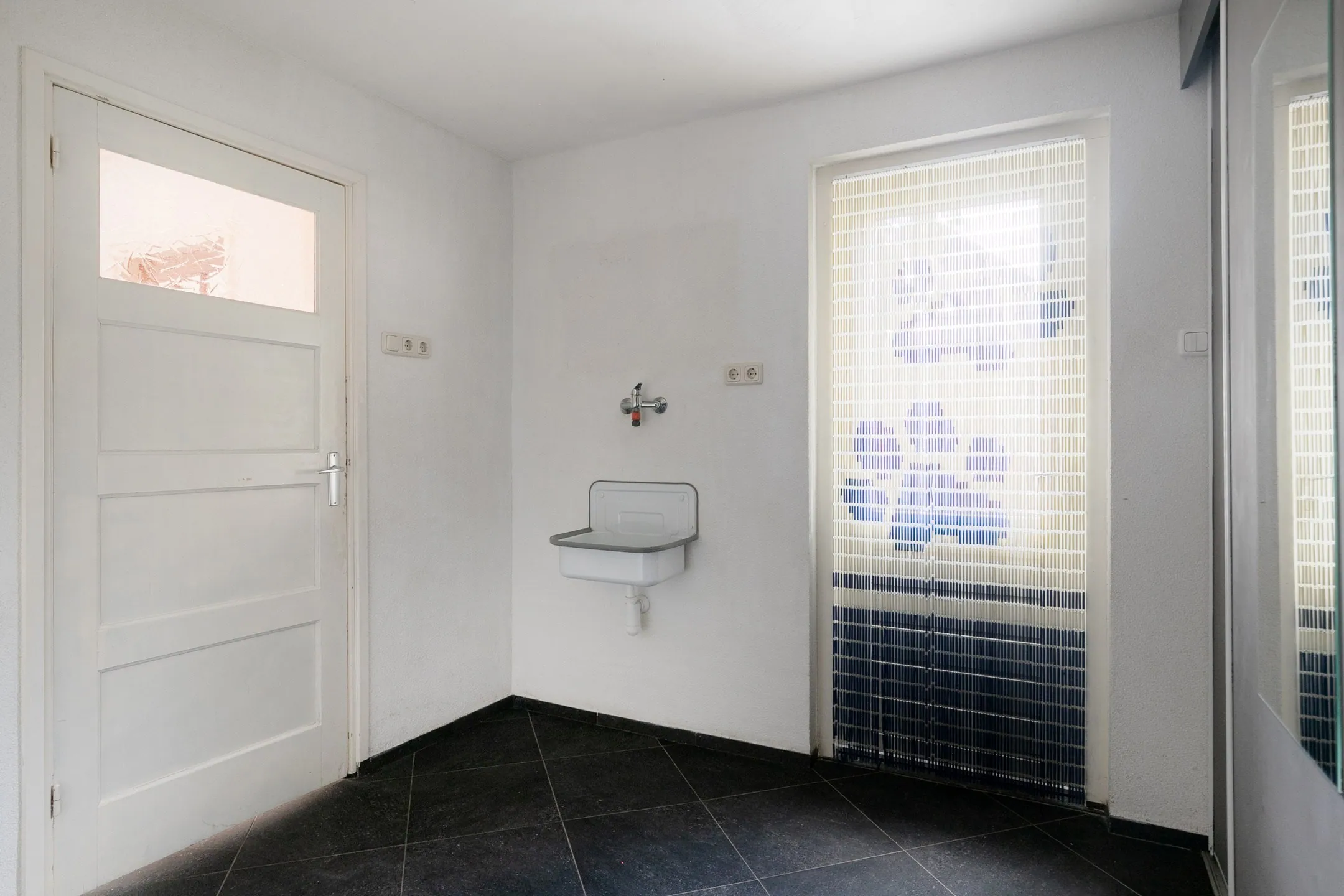 Aansluitend bevindt zich de bijkeuken met toegang tot het moderne toilet met fonteintje en een kamerhoge schuifkastenwand waarin de cv-combiketel is opgesteld en ruimte is voor wasapparatuur. Vanuit de bijkeuken is er toegang tot de achtertuin en tot de inpandige garage.