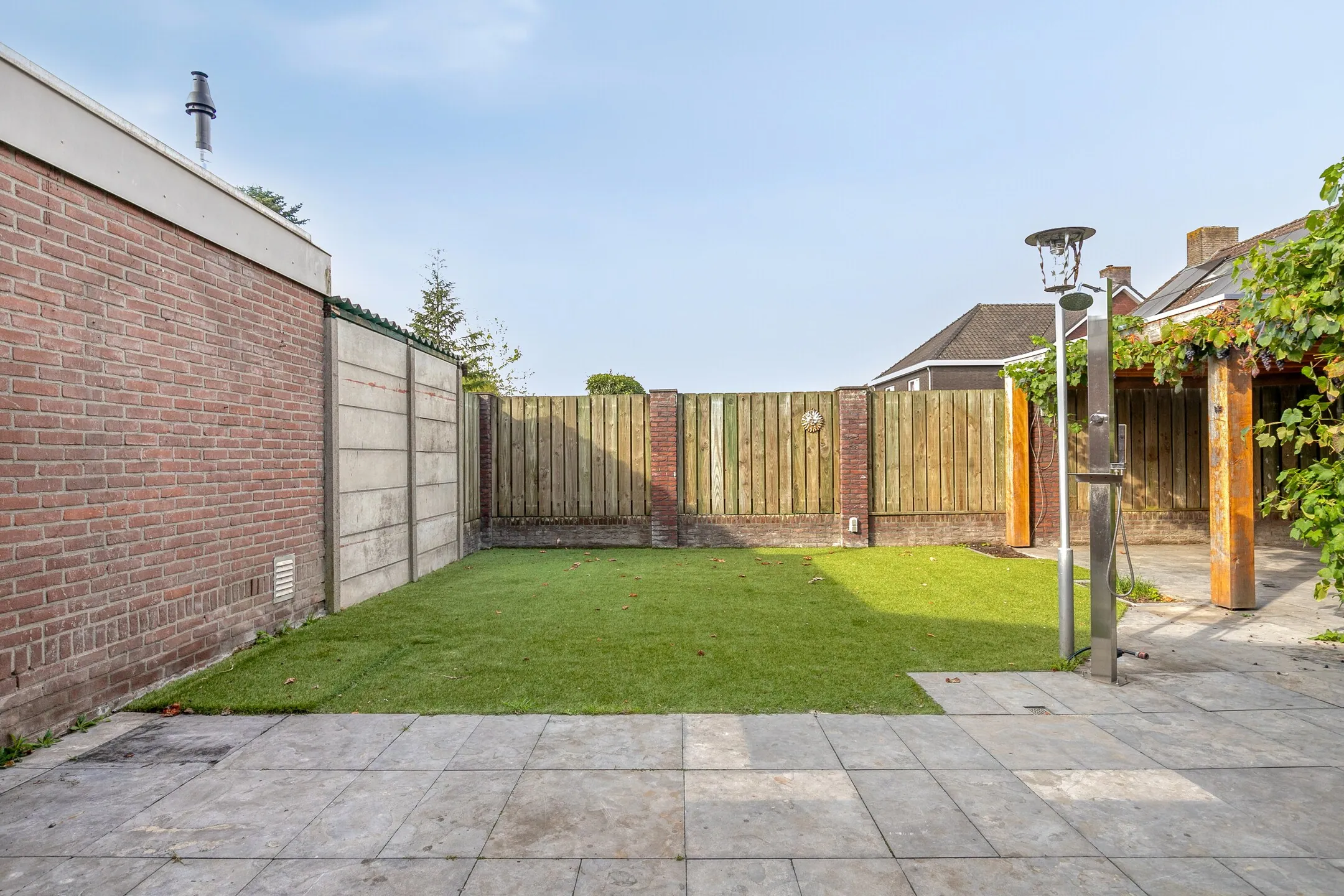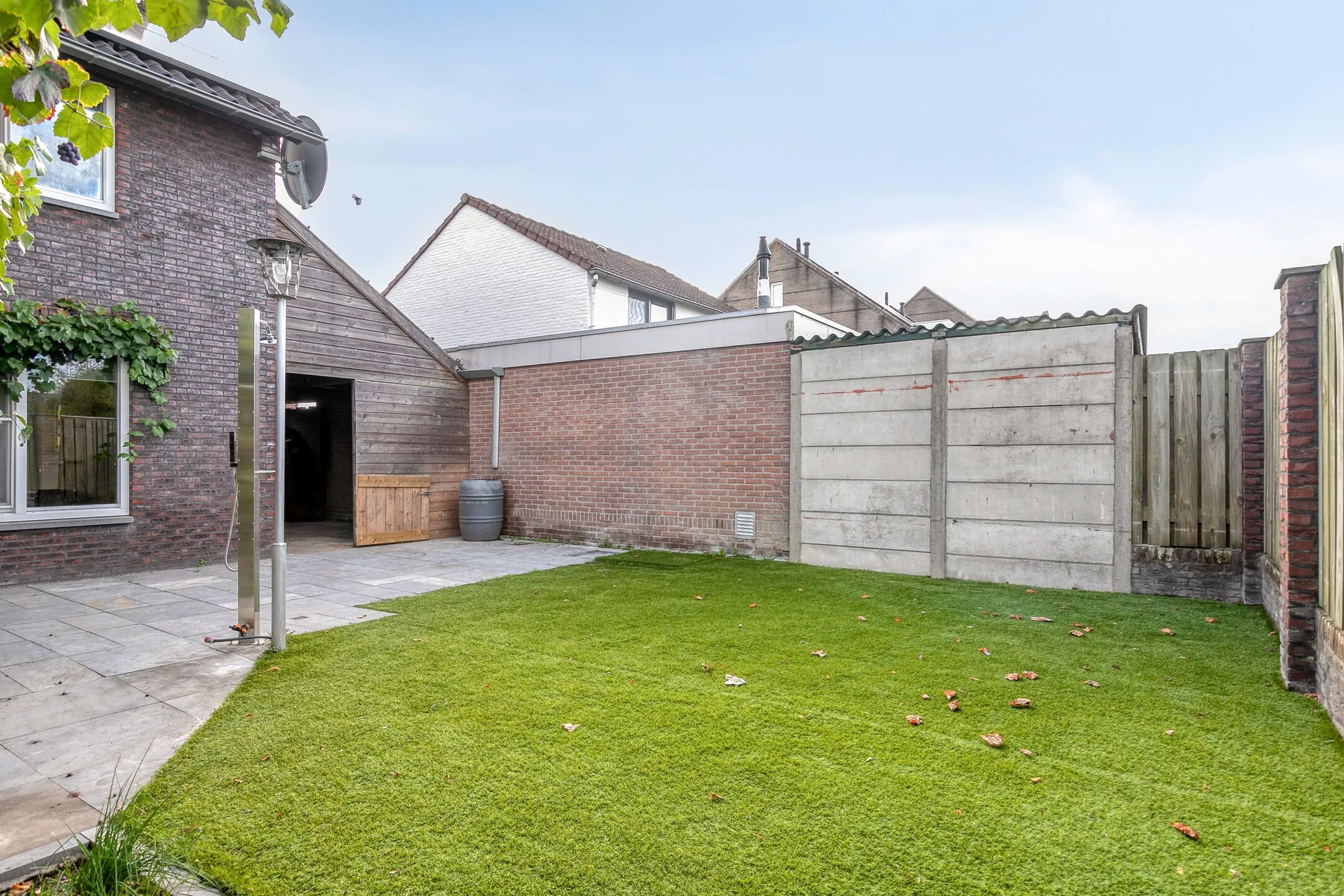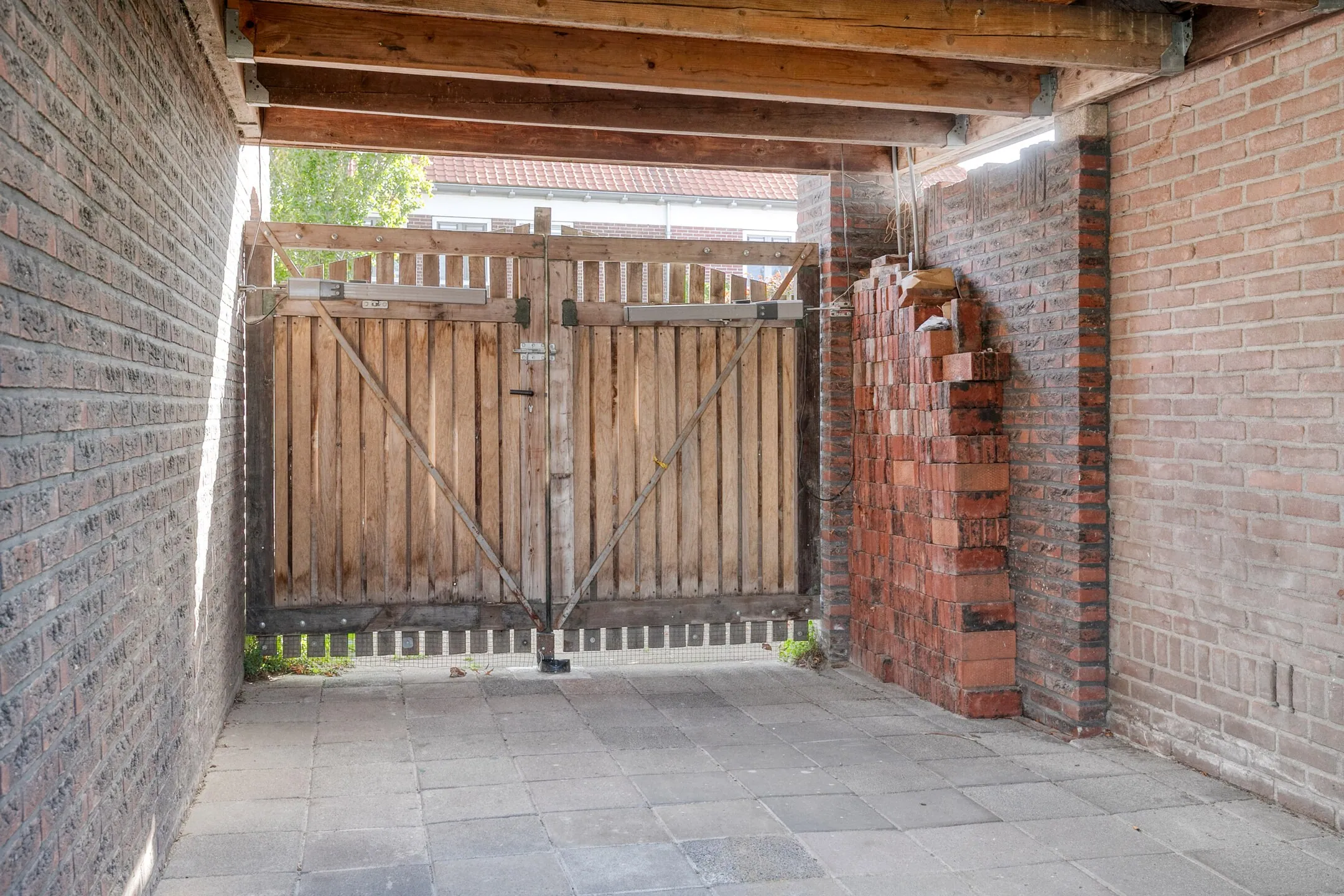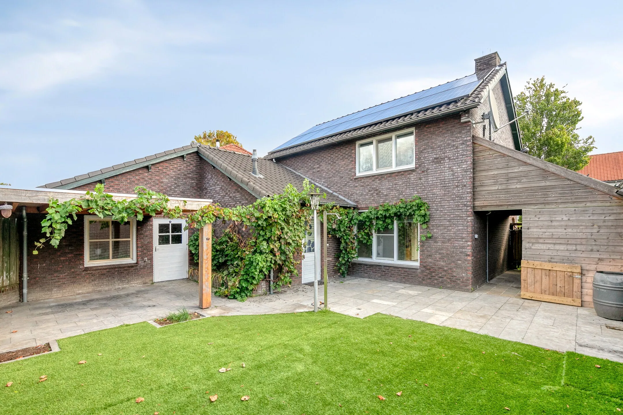 De woning beschikt over een inrit aan zowel de linker- als rechterzijde, waardoor er ruime parkeergelegenheid is op eigen terrein en eventueel plaats voor een caravan of aanhanger. Via de poort aan de linkerzijde is er een vrije achterom. Hier bevindt zich een overkapping/carport met een bergzoldertje. Aan de garage is een overkapping gerealiseerd met voldoende ruimte voor een tuin- of loungeset. De onderhoudsvriendelijke achtertuin is ingericht met kunstgras, sierbestrating en een buitendouche. Dankzij de ligging op het westen kunt u hier volop genieten van de zon.