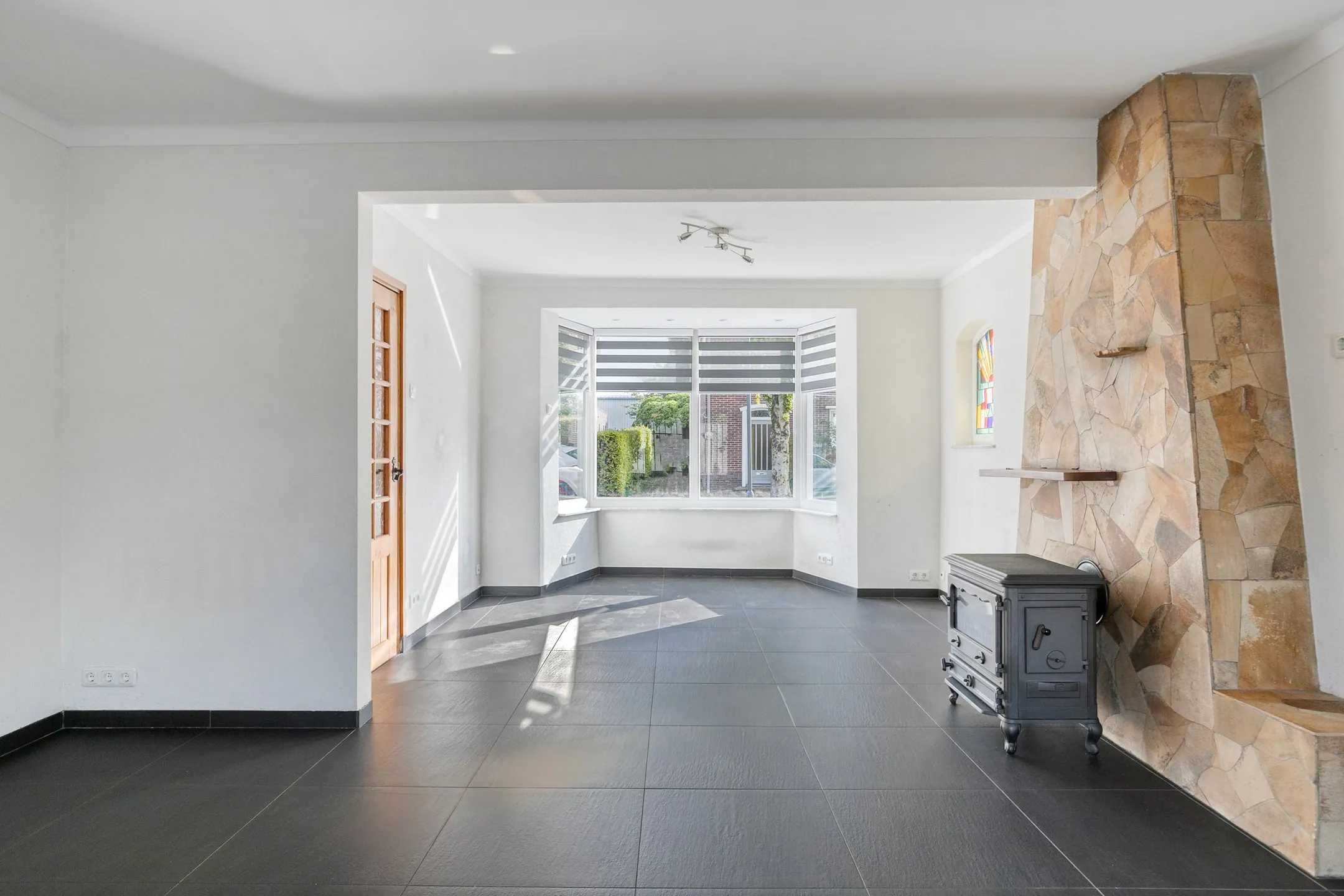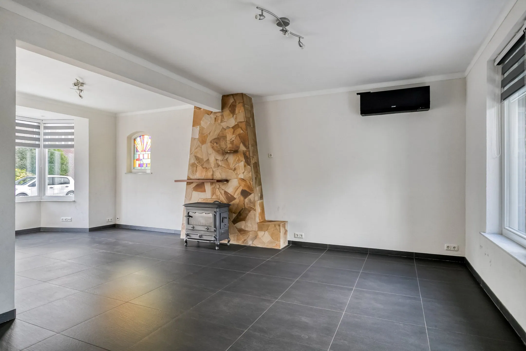 De doorzonwoonkamer is gelegen aan de linkerzijde van de woning en geniet van veel lichtinval. Het authentieke glas-in-lood raam vormt een sfeervol detail. Aan de voorzijde bevindt zich een erker en in de woonkamer is de schouw met houtkachel behouden. De aanwezige airco kan zowel koelen als verwarmen en werkt efficiënt in combinatie met de zonnepanelen.