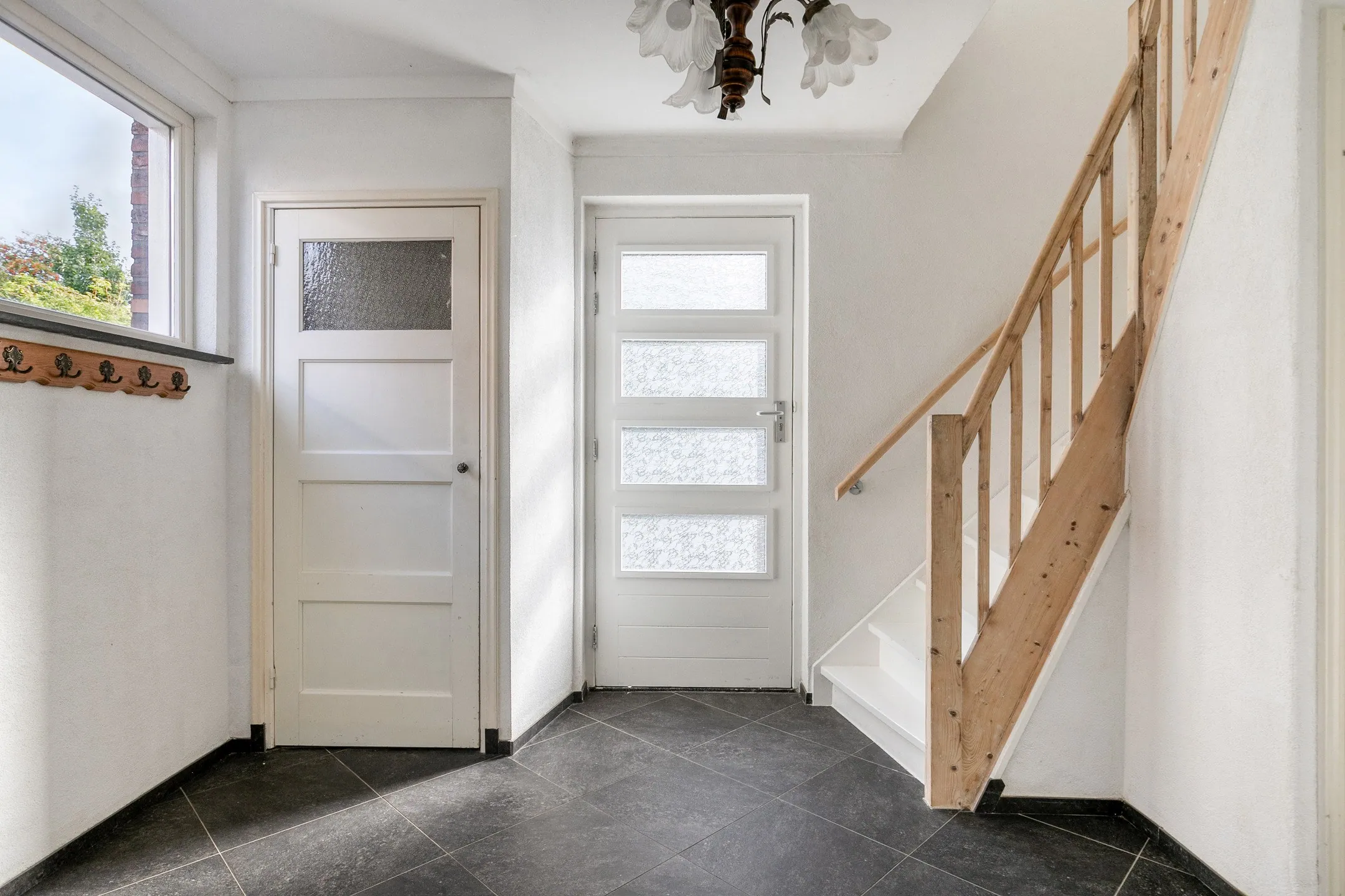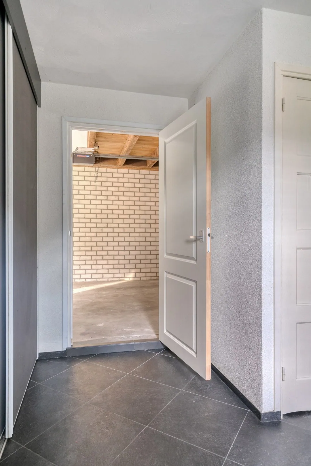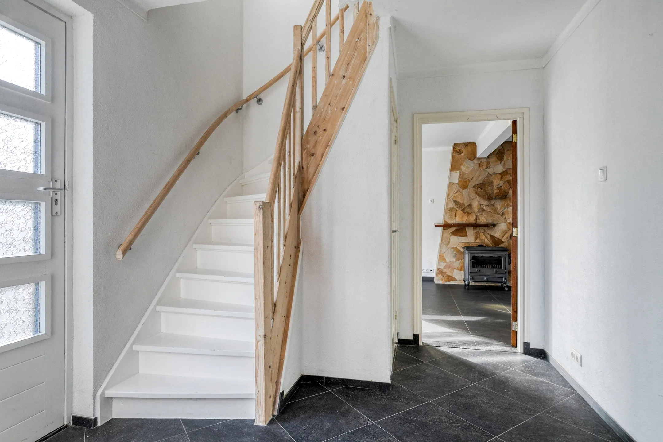 Via de voordeur betreedt u de hal/entree van de woning. Hier bevindt zich, net als op de rest van de begane grond, een donkere tegelvloer met vloerverwarming, stucwerkwanden en een schuurwerk plafond. Vanuit de hal heeft u toegang tot de vernieuwde meterkast, de grote manshoge kelder, de keuken en de woonkamer.