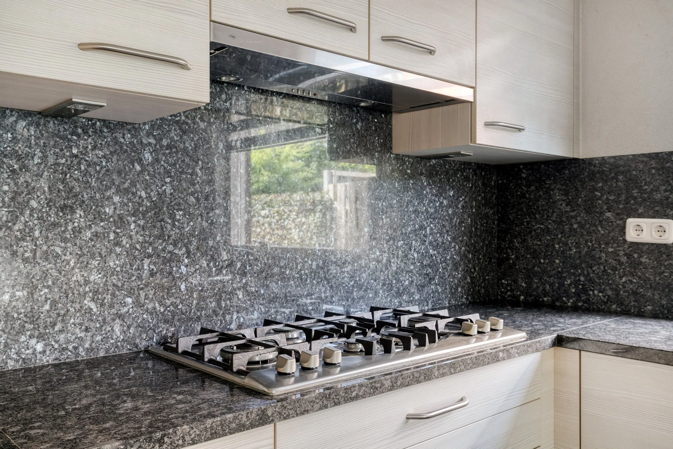 De keuken is bereikbaar vanuit zowel de hal als de woonkamer en is ingericht met een moderne, lichte keukenopstelling. Het raam biedt zicht op de inrit aan de rechterzijde van de woning. De keuken is uitgerust met een rvs spoelbak, een 6-pits gaskookplaat (met eenvoudige mogelijkheid tot overstap naar inductie), rvs afzuigkap, koelkast, combi-oven en vaatwasser.