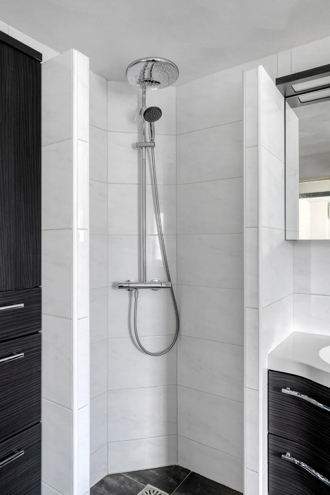 De overloop geeft toegang tot drie slaapkamers, de badkamer en het luik met vlizotrap naar de bergzolder. Alle slaapkamers zijn van een goed formaat en voorzien van een airco waarmee zowel gekoeld als verwarmd kan worden. De verdieping is afgewerkt met laminaatvloeren en stucwerk wanden en plafonds. De moderne badkamer is volledig betegeld en ingericht met een royaal ligbad, een inloopdouche, een tweede toilet en een wastafelmeubel.